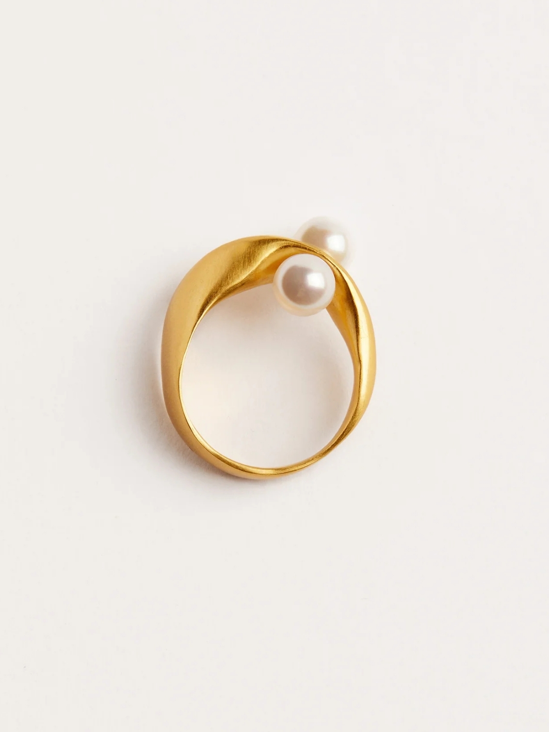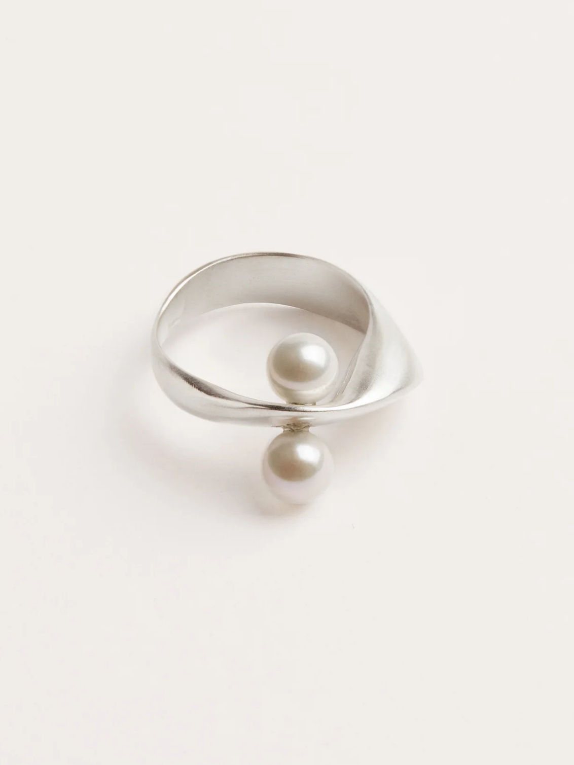 A ring of connection. Two 6mm pearls sit opposite one another, bound by a delicately twisted band that turns like a quiet thread. The design carries the gesture of union — a meeting point of softness and form.
