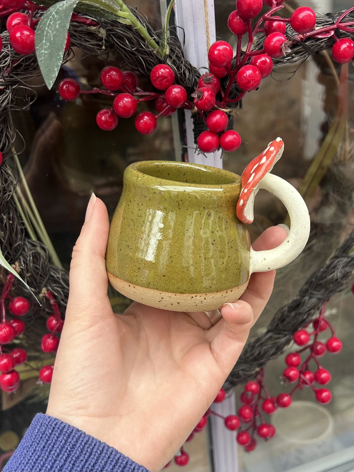 This handcrafted ceramic espresso mug features a sculpted mushroom as the handle, adding a whimsical, woodland twist to your daily coffee ritual.