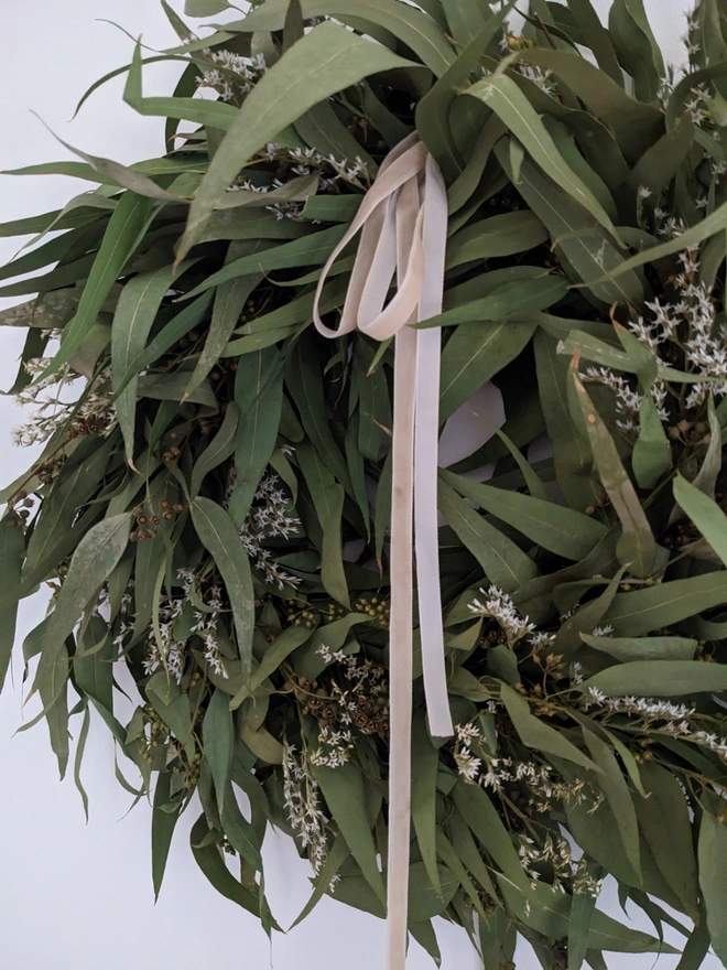 Materials: Dried eucalyptus, white statice flowers, cream velvet ribbon