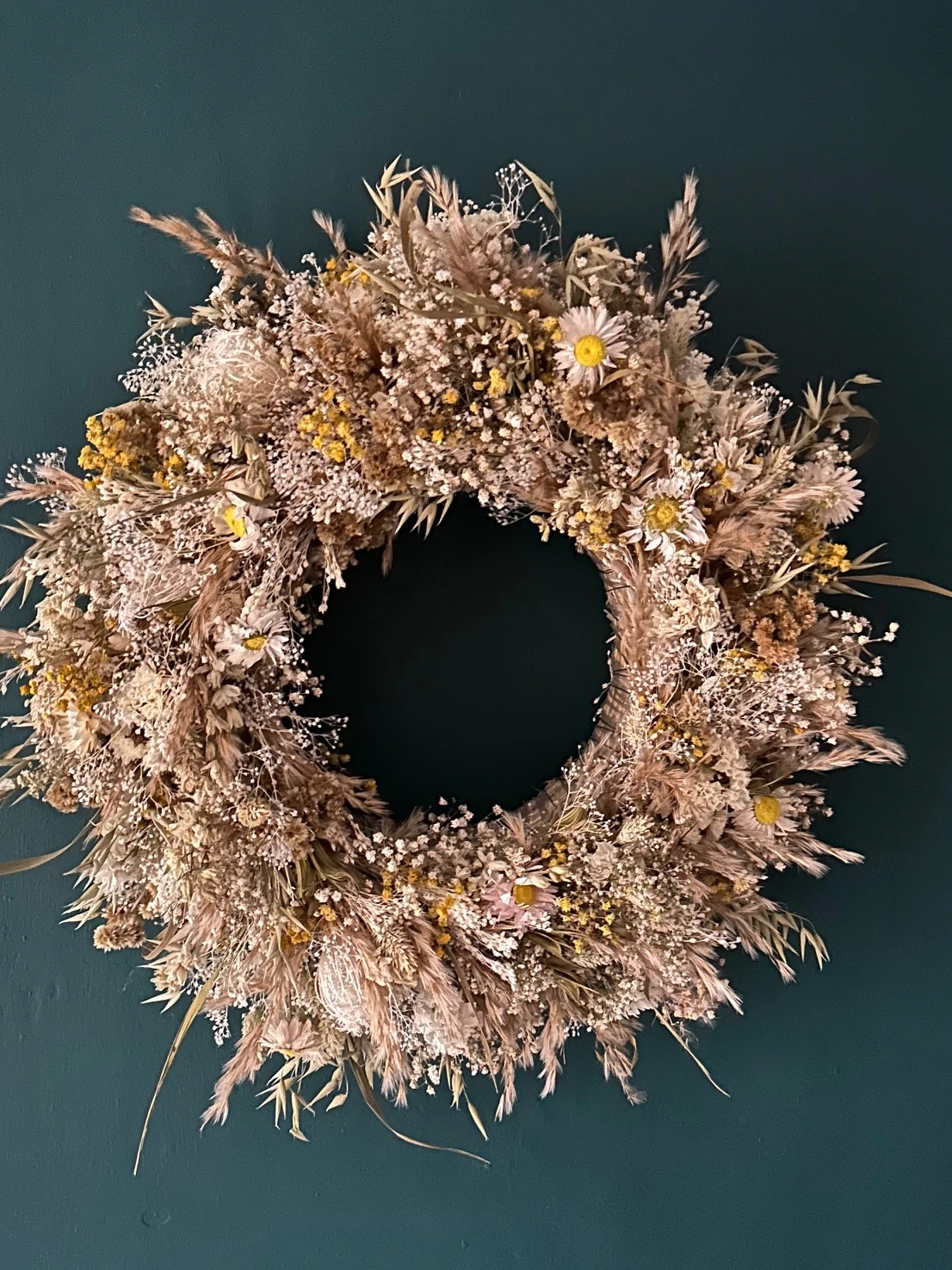 Hand crafted Dried flower rustic natural Wall or door wreath. This timeless elegant wreath is a show stopper for any home featuring a harmonious blend of grasses, pale yellow and white gypsophilia, straw flowers and pampas grass. Perfect for all year round its organic textures and muted tones bring warmth and charm to any interior. A beautiful gift for that nature loving person in your life.