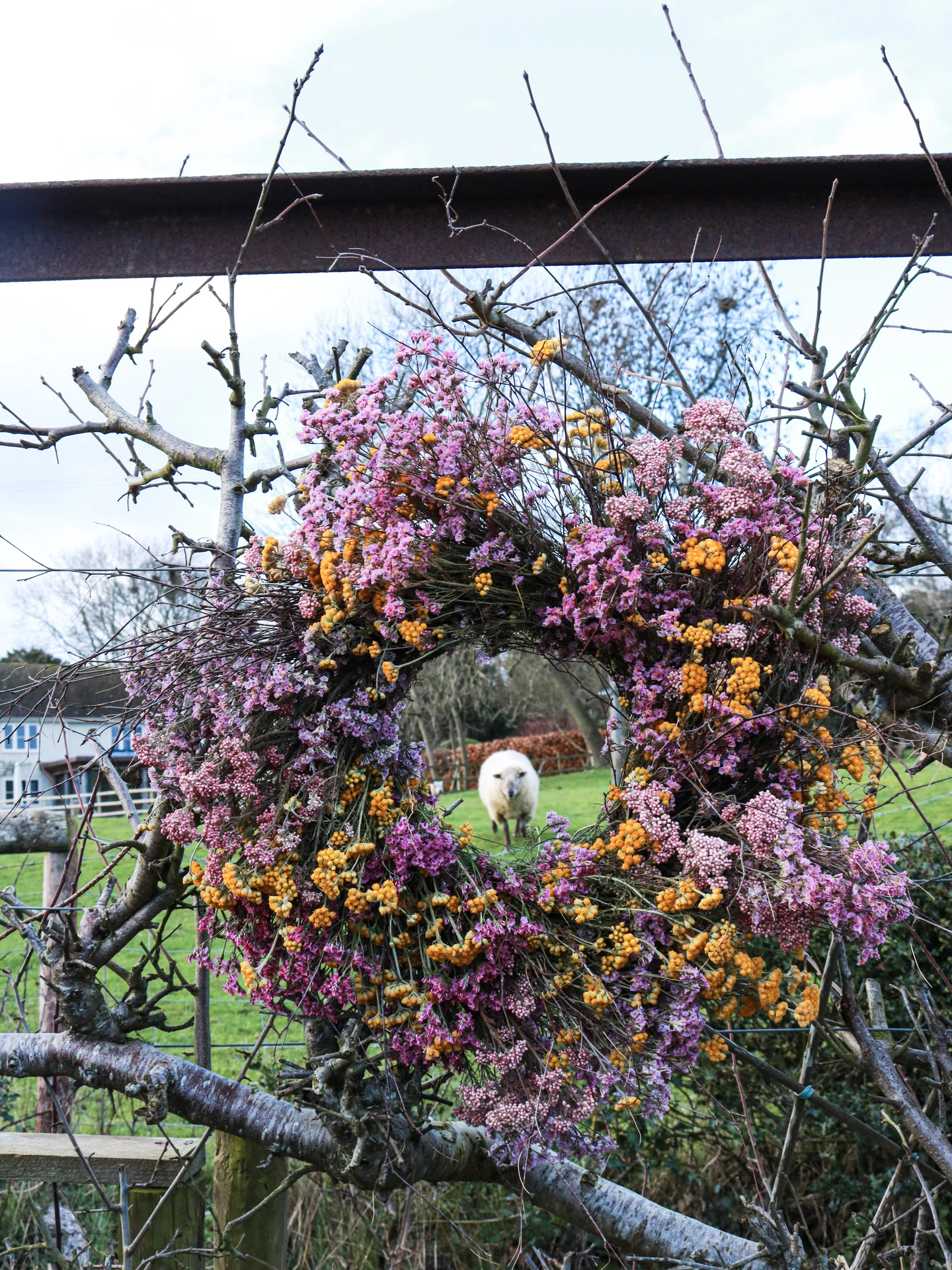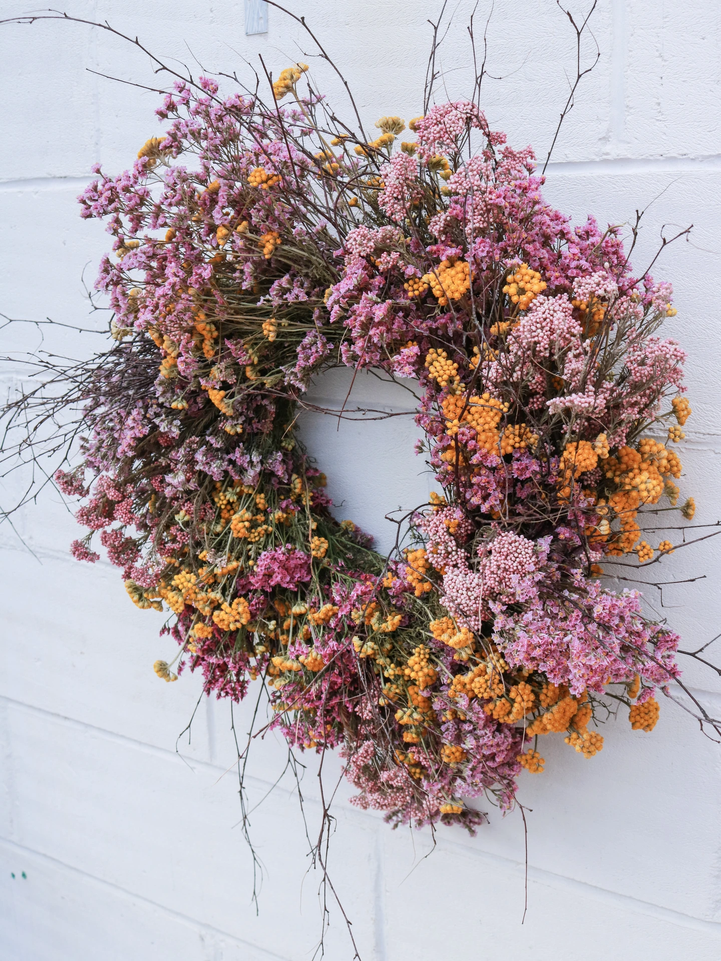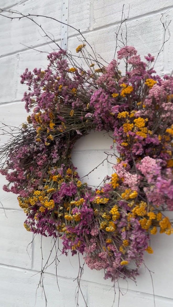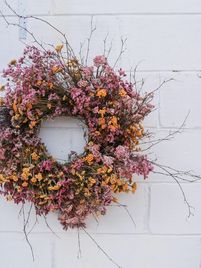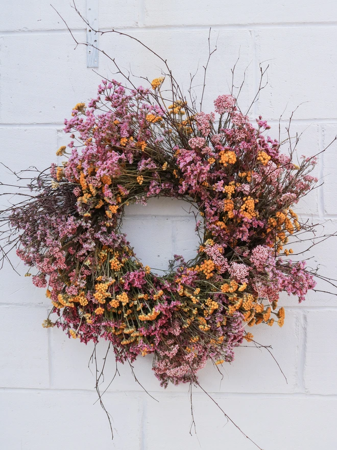 Beautiful Pink & Yellow Wreath with foraged Birch. Created entirely from lasting dried flowers.