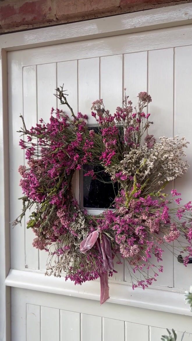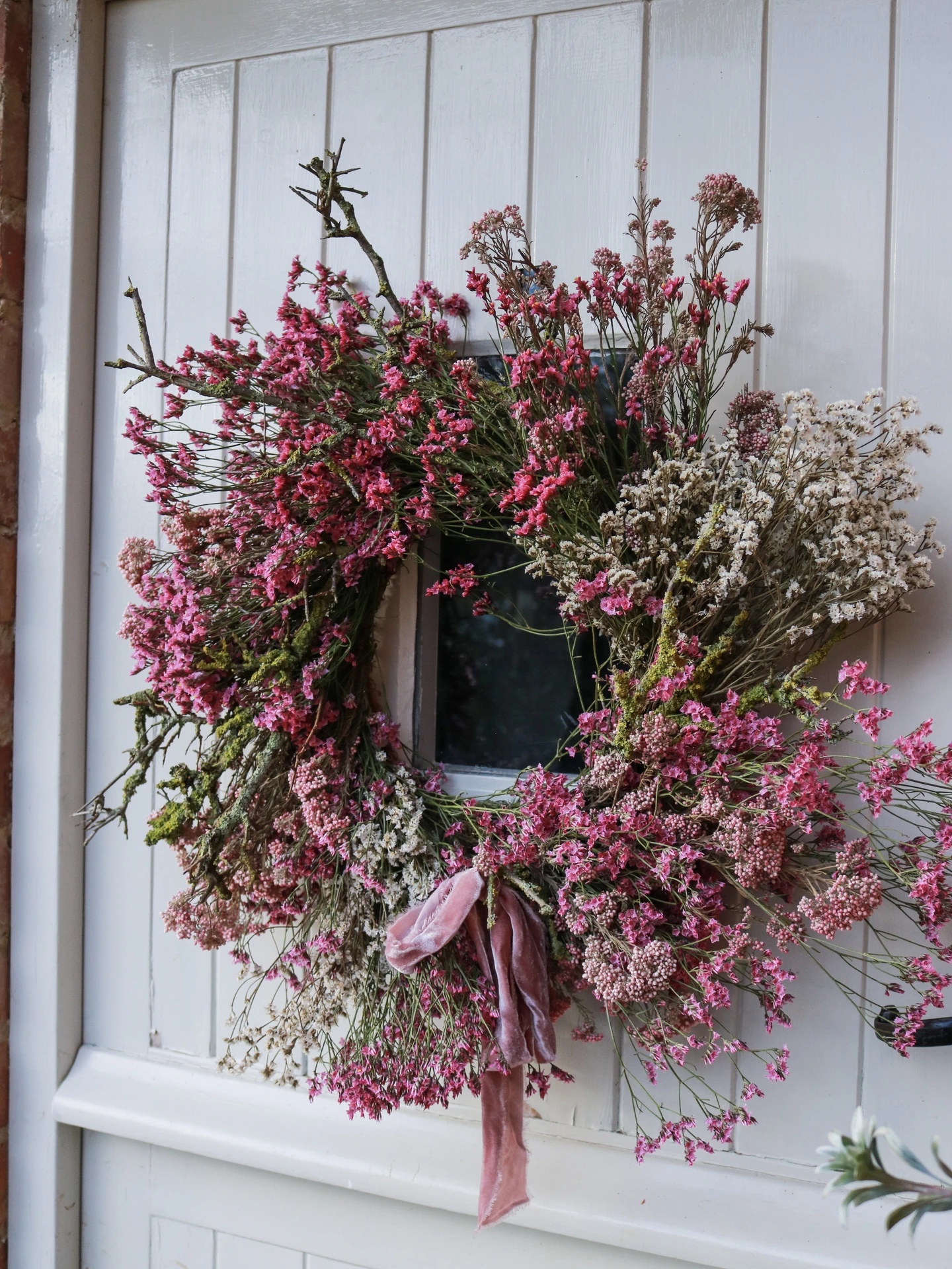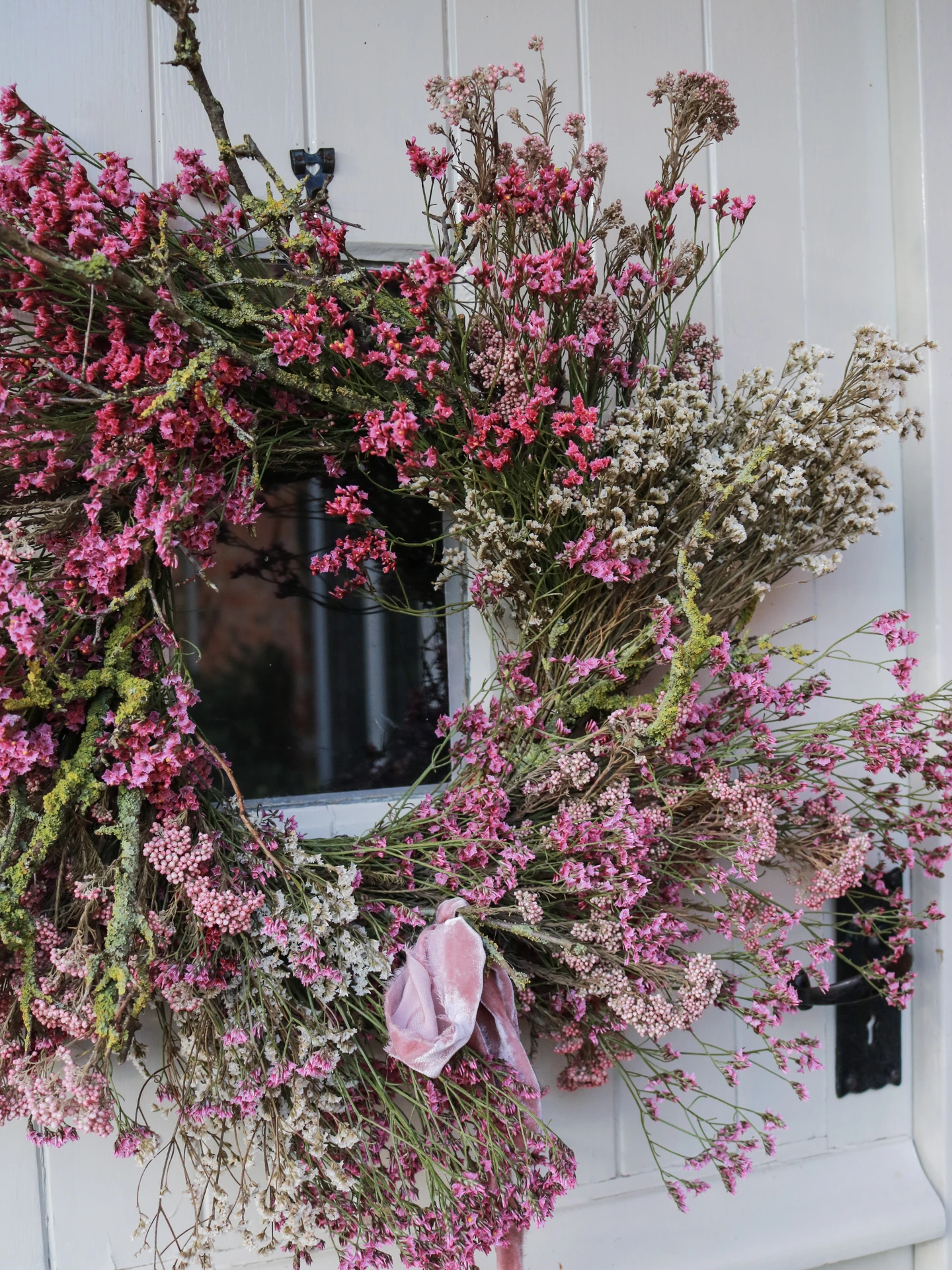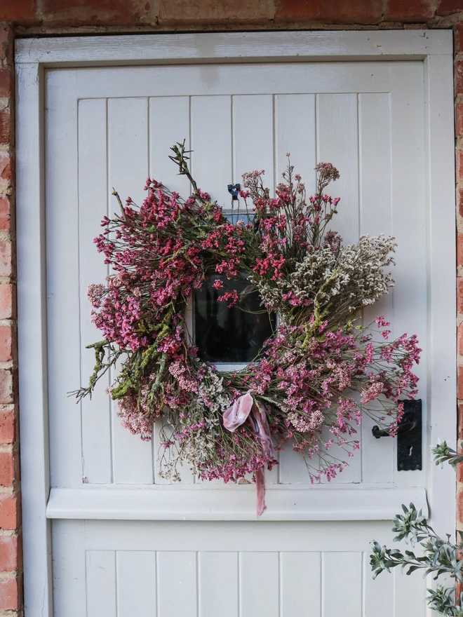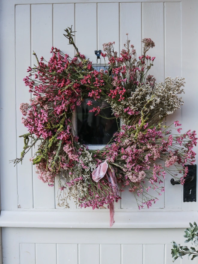 Beautiful pink, yellow & white wreath with foraged Lichen. Created entirely from lasting dried flowers.
