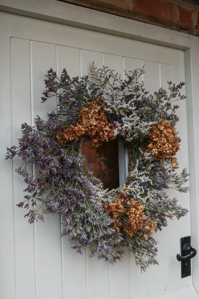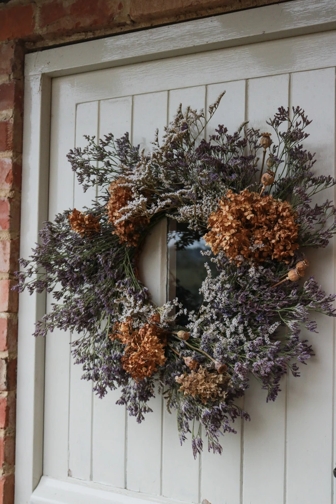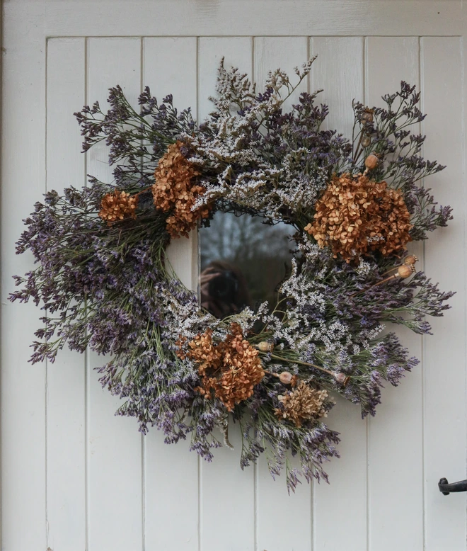 Beautiful Purple and White wreath with dried Hydrangea & Poppy seed heads.