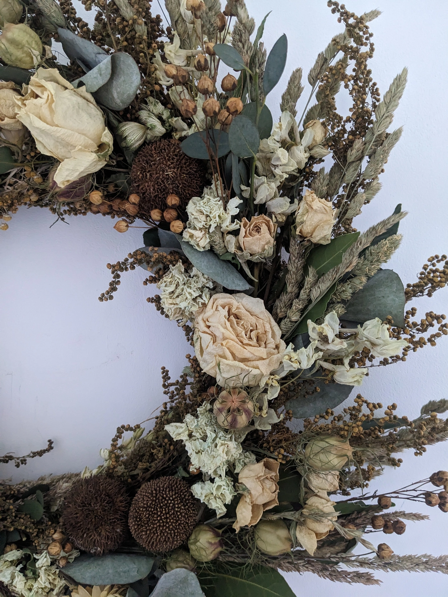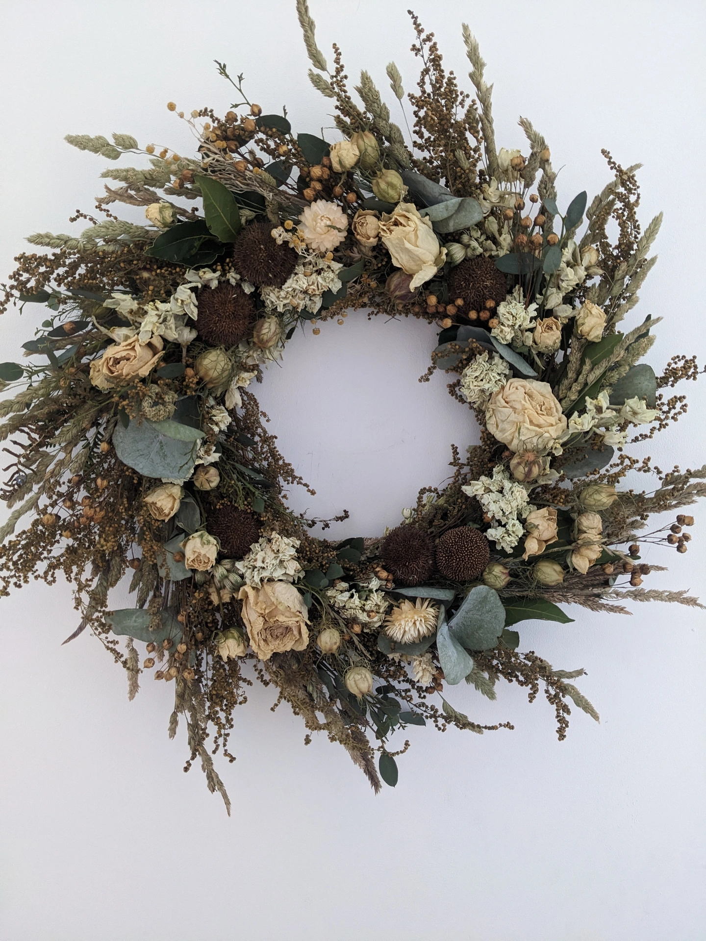 This everlasting wreath, handmade from natural dried flowers in muted tones with round platan seedpods and beautiful roses. measures approximately 50cm in diameter. Delicate yet full of texture, it makes a beautiful finishing touch to any home — perfect for adding a touch of warmth and charm year-round.
