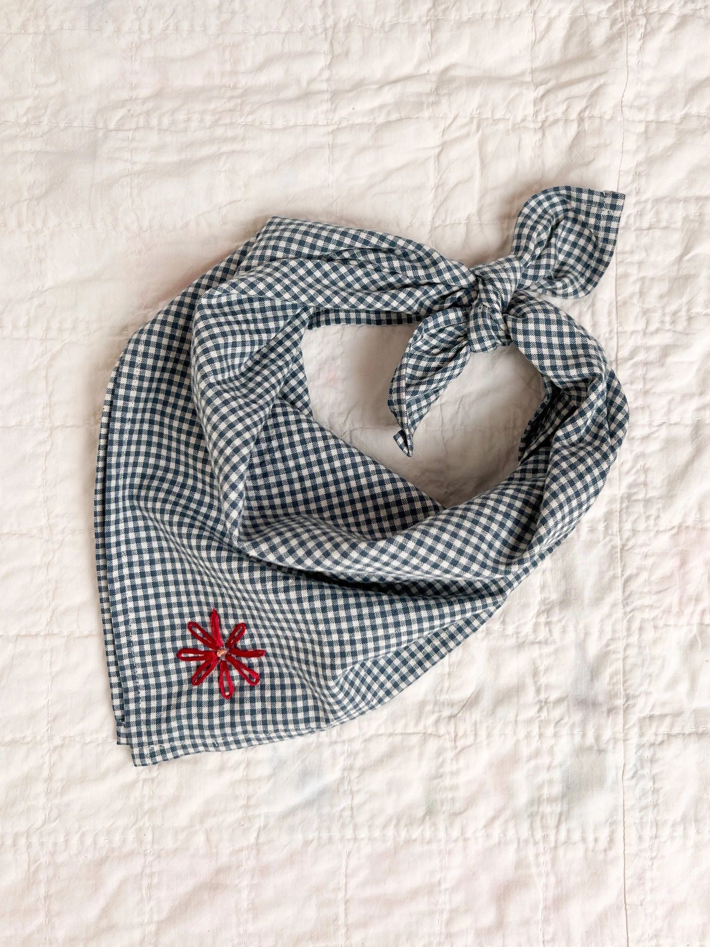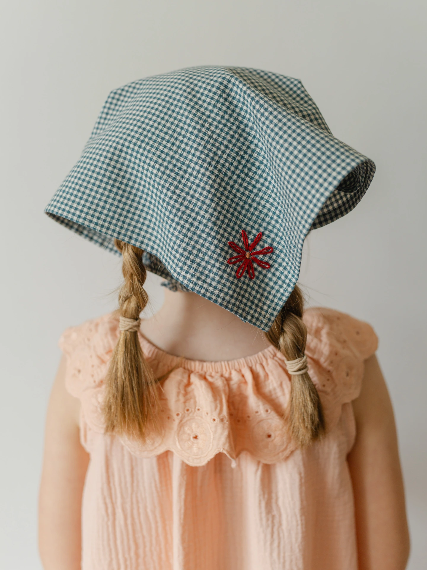 The Evie Scarf is designed and embroidered by us from very soft cotton gingham, made to be used on the head or around the neck. The choice is yours.
