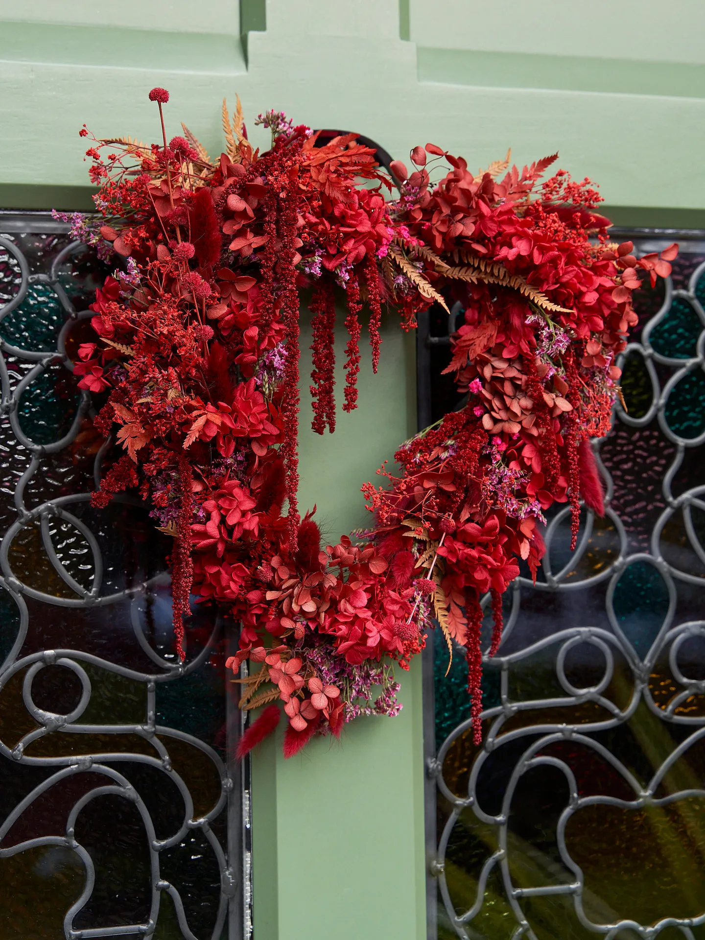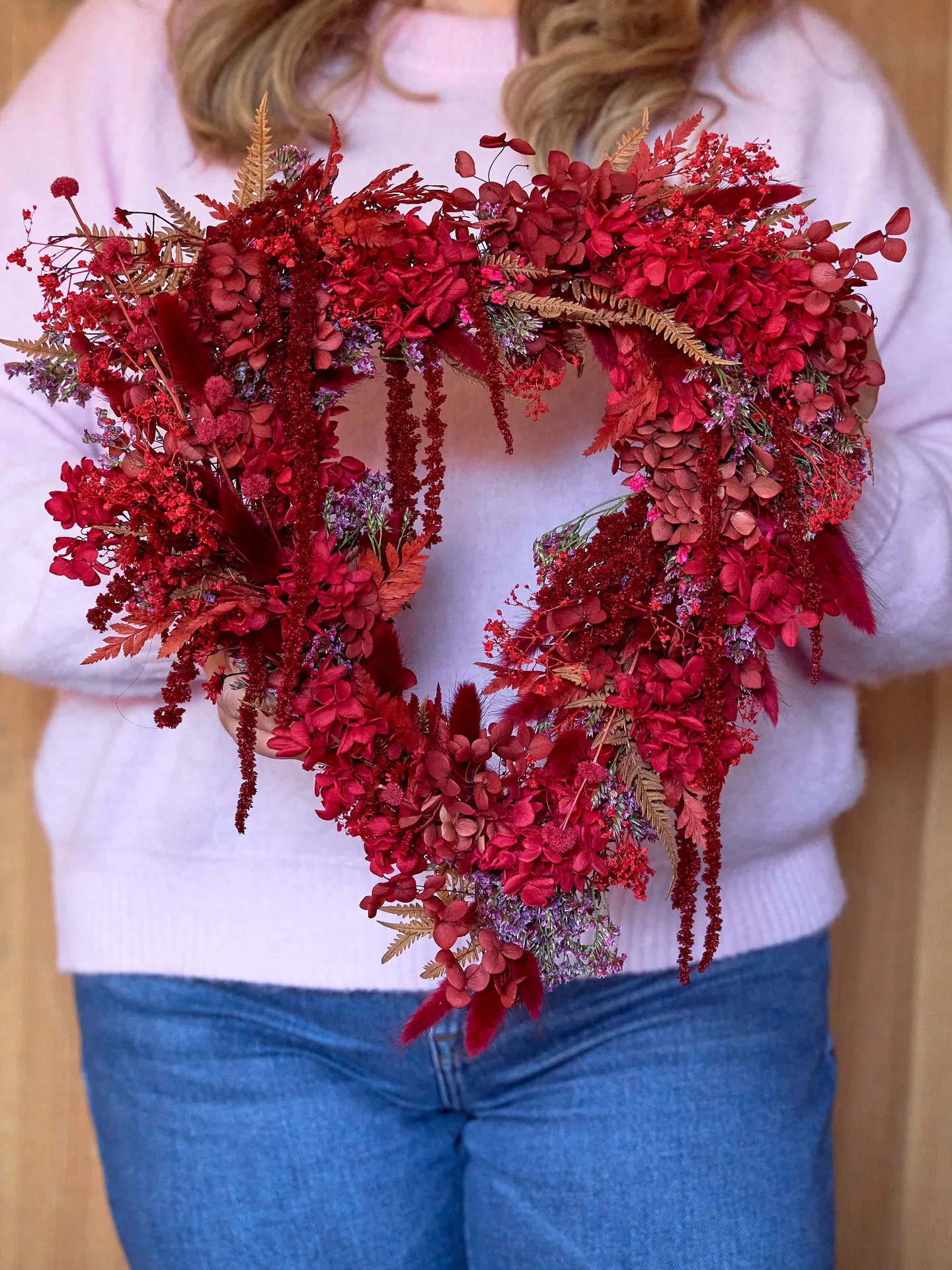 A stunning gift and perfect addition for a door or wall hanging. Featuring amaranthus, gypsophila, dyed ruscus and other dried and preserved florals.