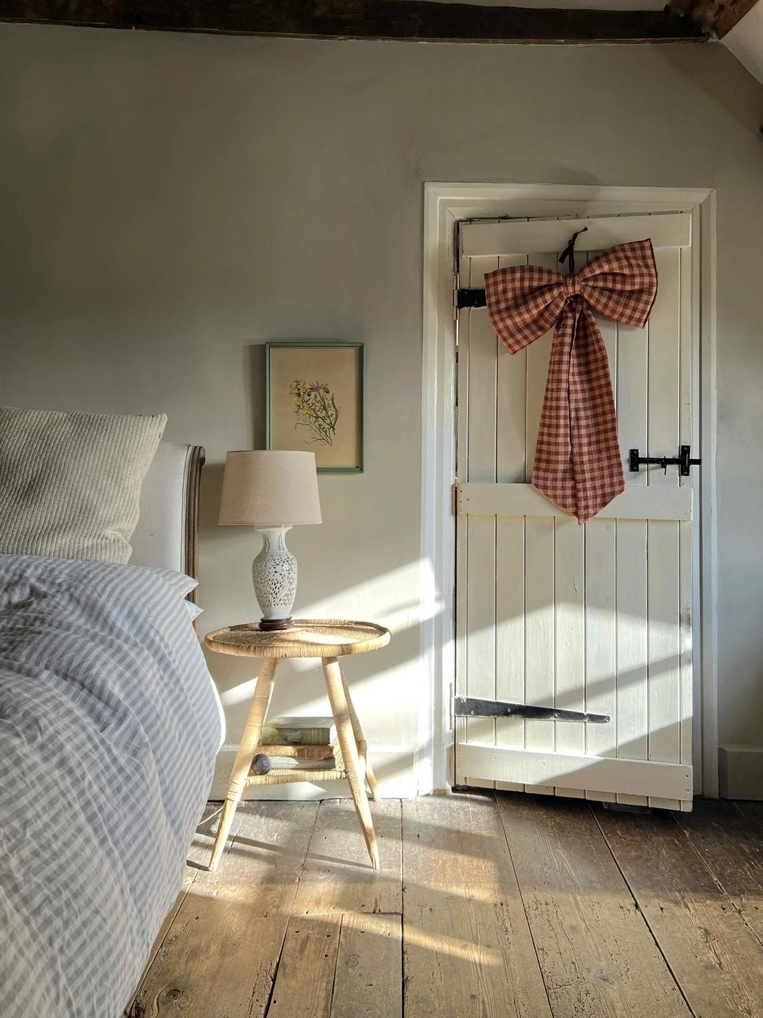 All of our linen bows are made using high quality, 100% EU tumbled linens, which means they are beautifully slubby and soft. This bow being made using a toffee gingham linen and threaded with velvet ribbon for hanging. Handmade in Suffolk.