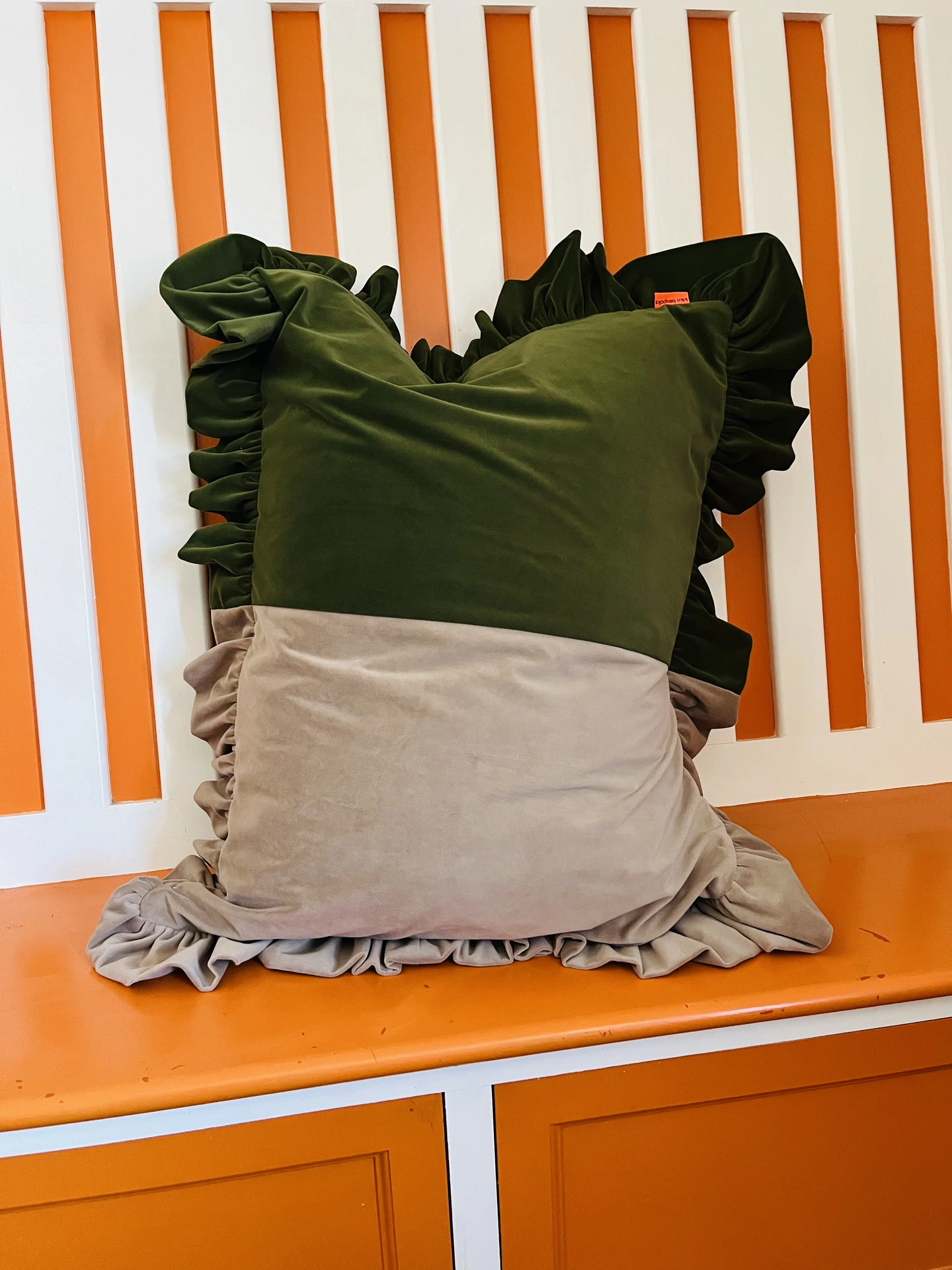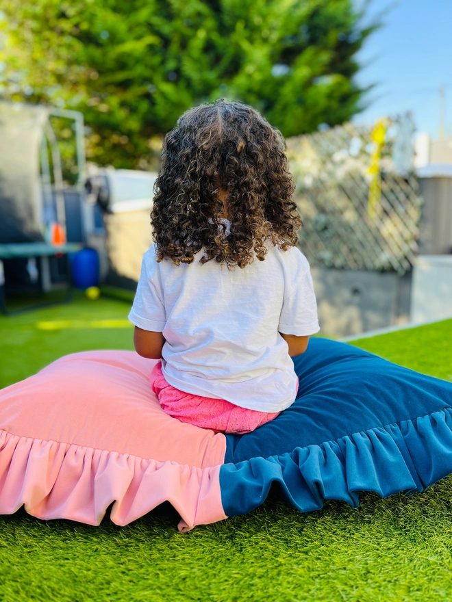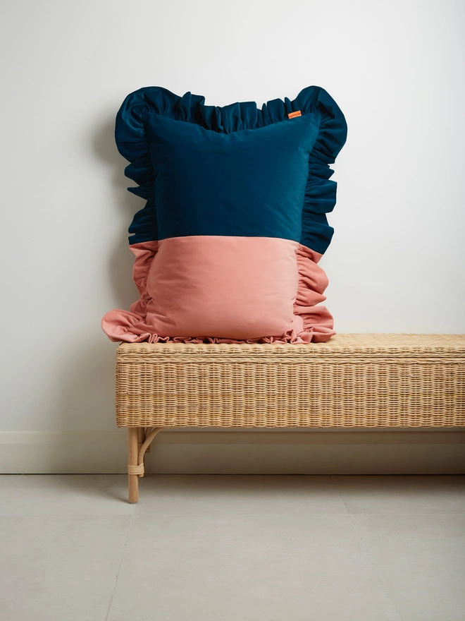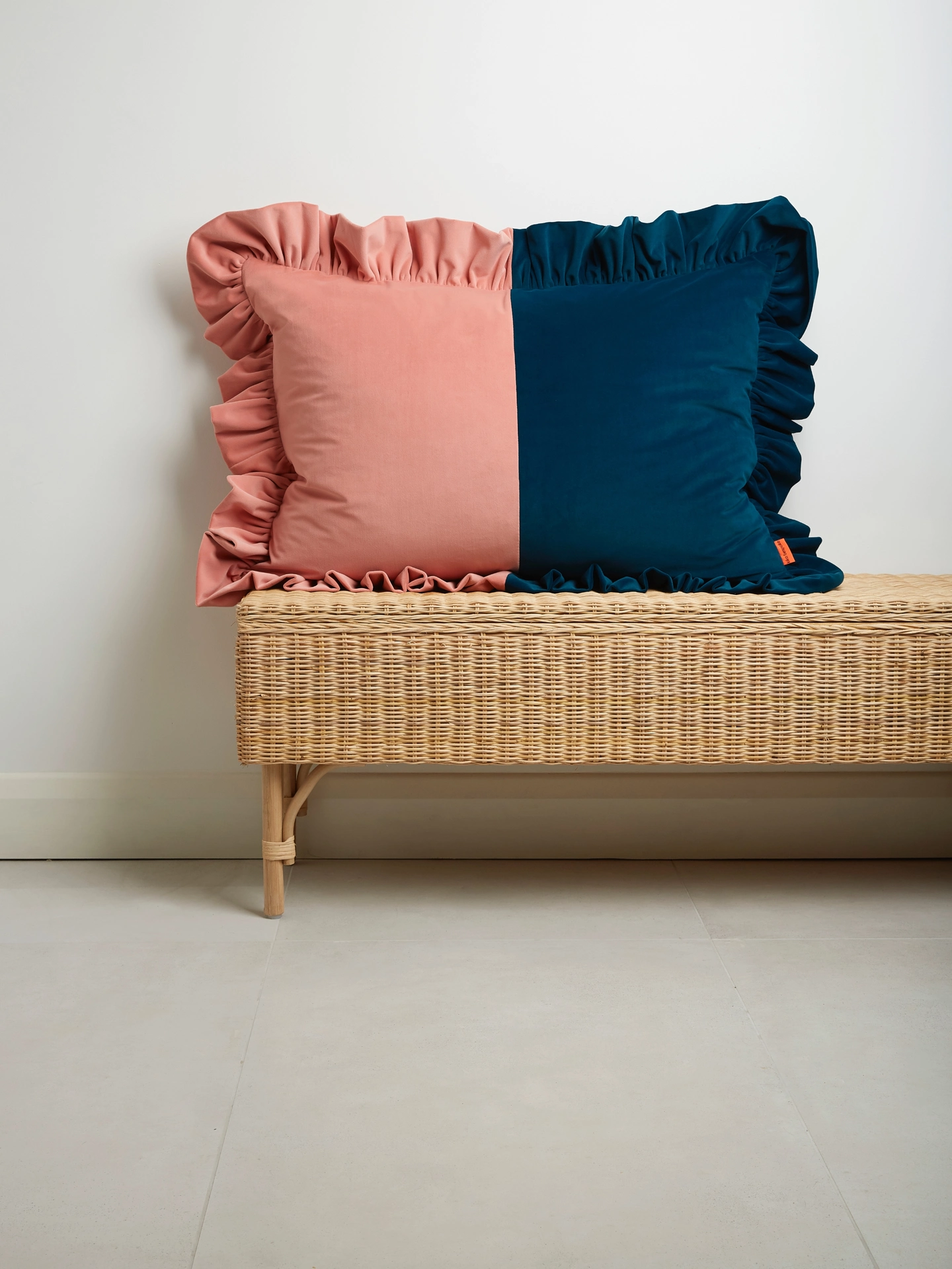 A large, chunky cushion suitable for use as comfortable floor seating or as a lumbar bolster for a bed. It features a two-tone design where each half of the face is a different colour. The design is finished with a large, decorative ruffle edge.