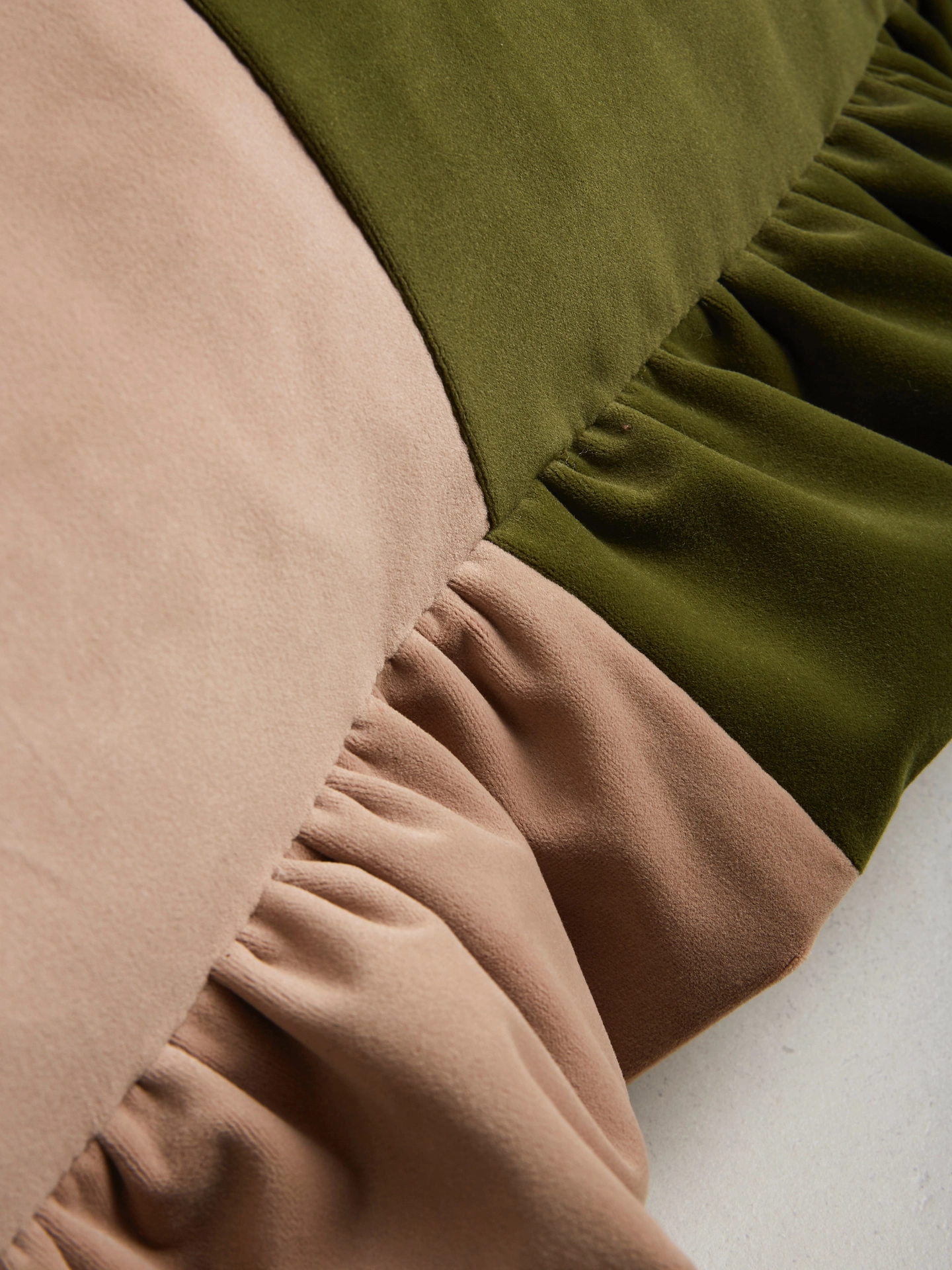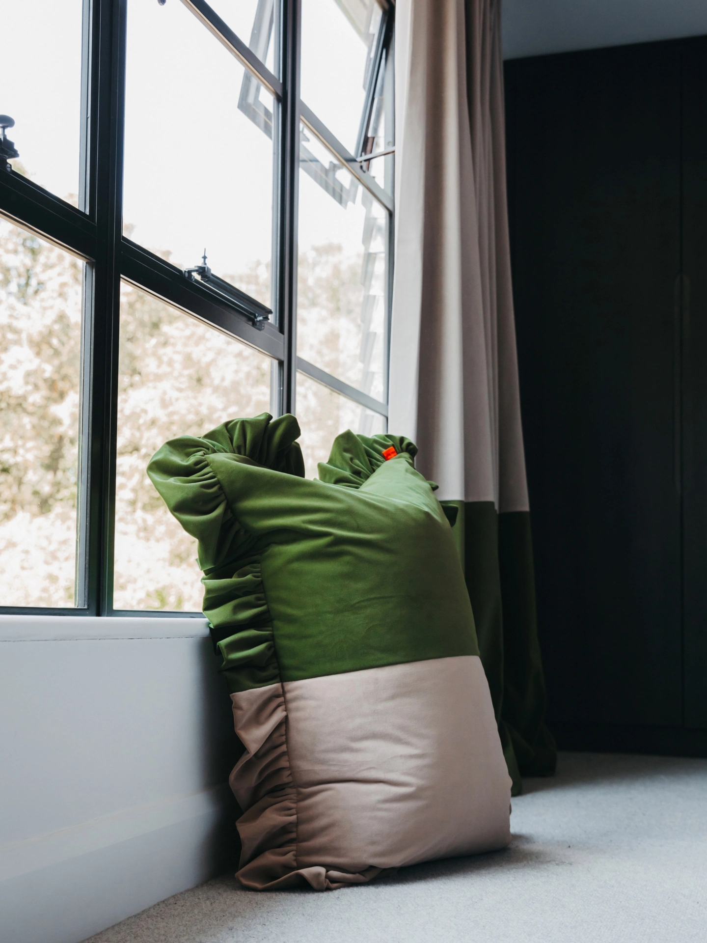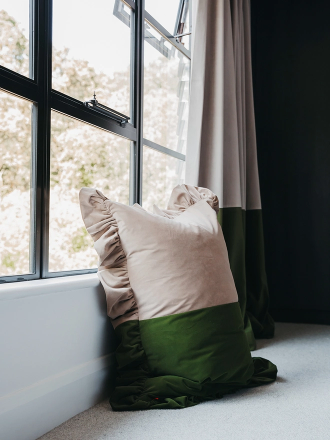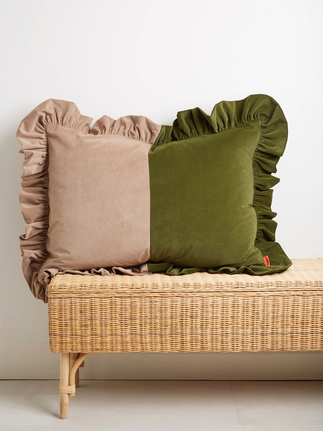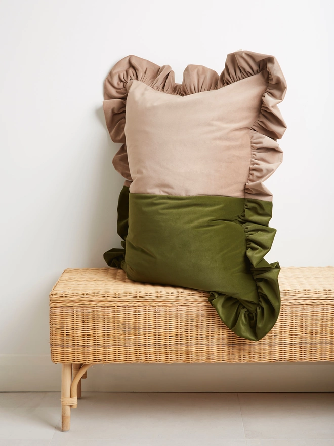A large, chunky cushion suitable for use as comfortable floor seating or as a lumbar bolster for a bed. It features a two-tone design where each half of the face is a different colour. The design is finished with a large, decorative ruffle edge.