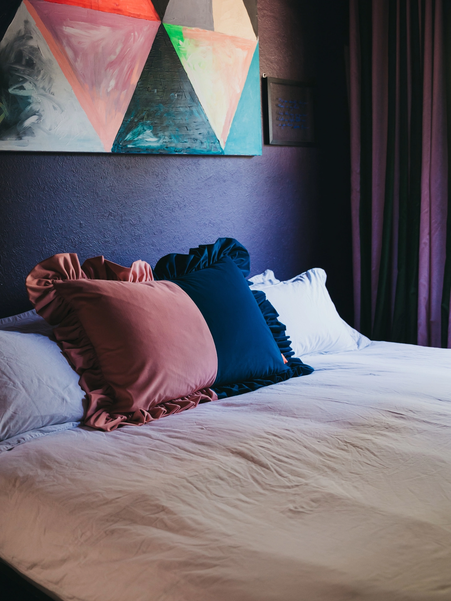 A large, chunky cushion suitable for use as comfortable floor seating or as a lumbar bolster for a bed. It features a two-tone design where each half of the face is a different colour. The design is finished with a large, decorative ruffle edge...
