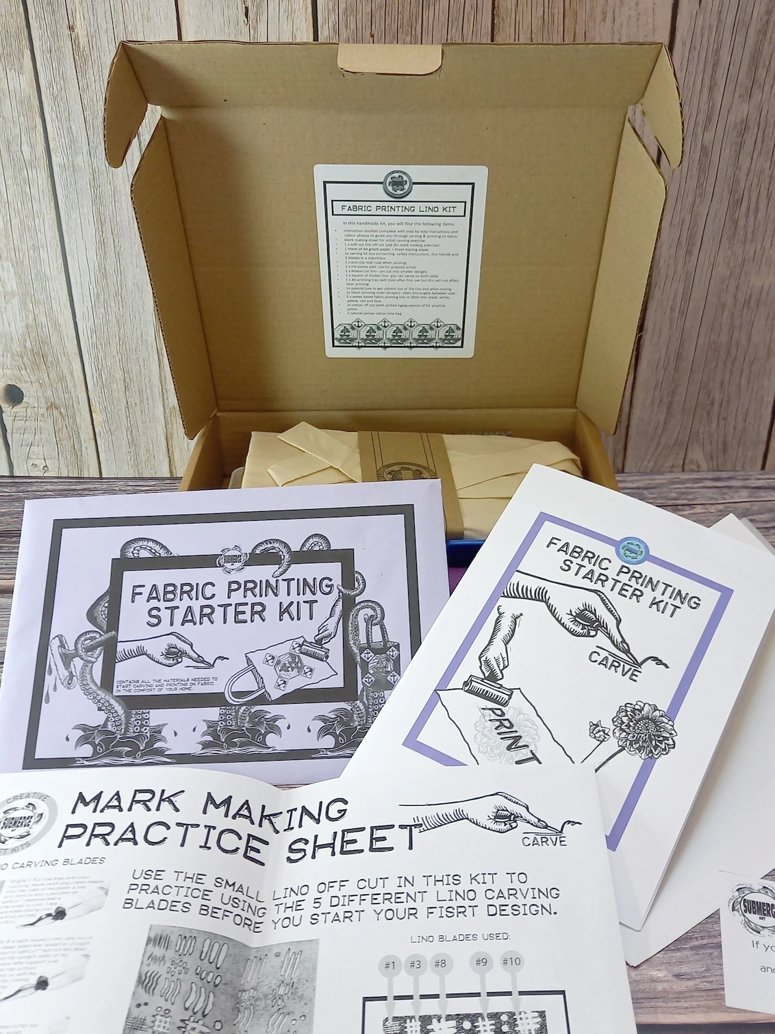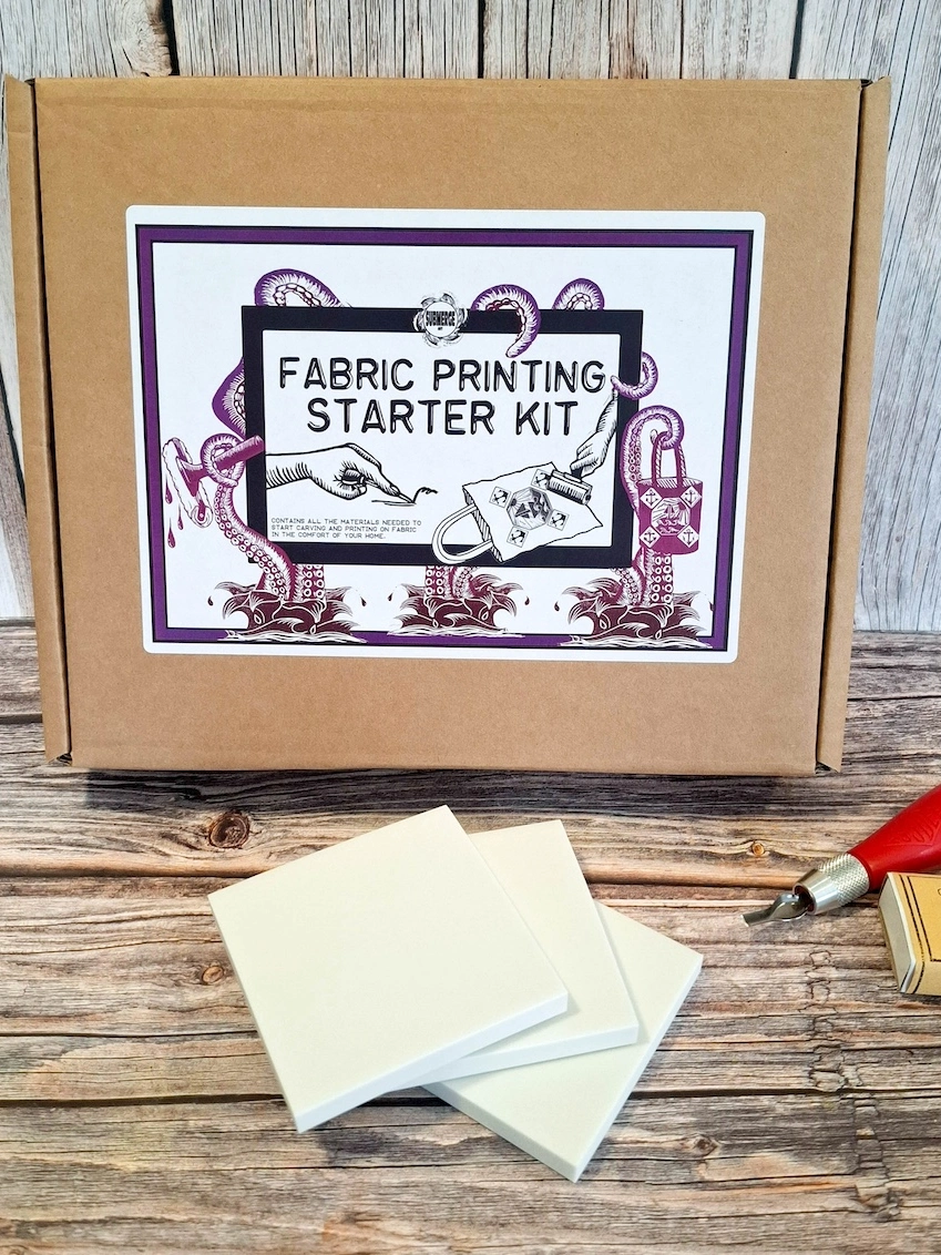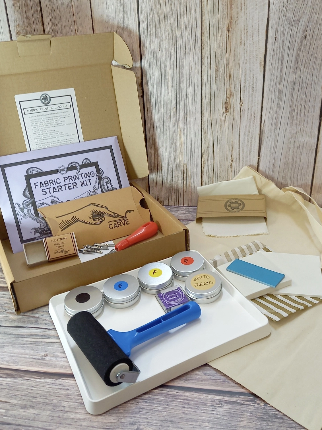 Fabric (textile) printing craft kit containing step by step instructions to help you create and carve your own designs and gain confidence in lino printing onto fabric from the comfort of your own home. Unlike other kits contains everything you need to su...