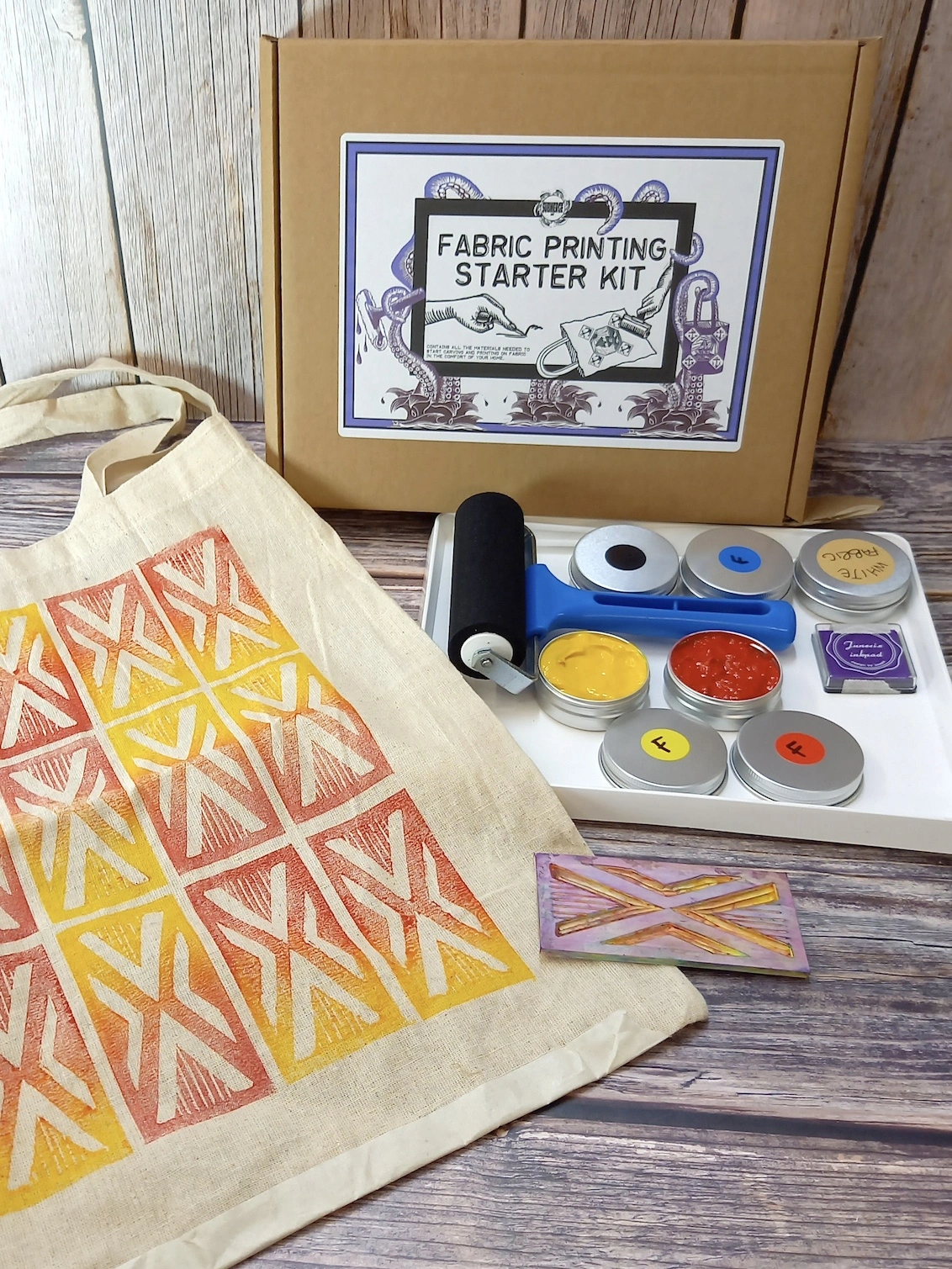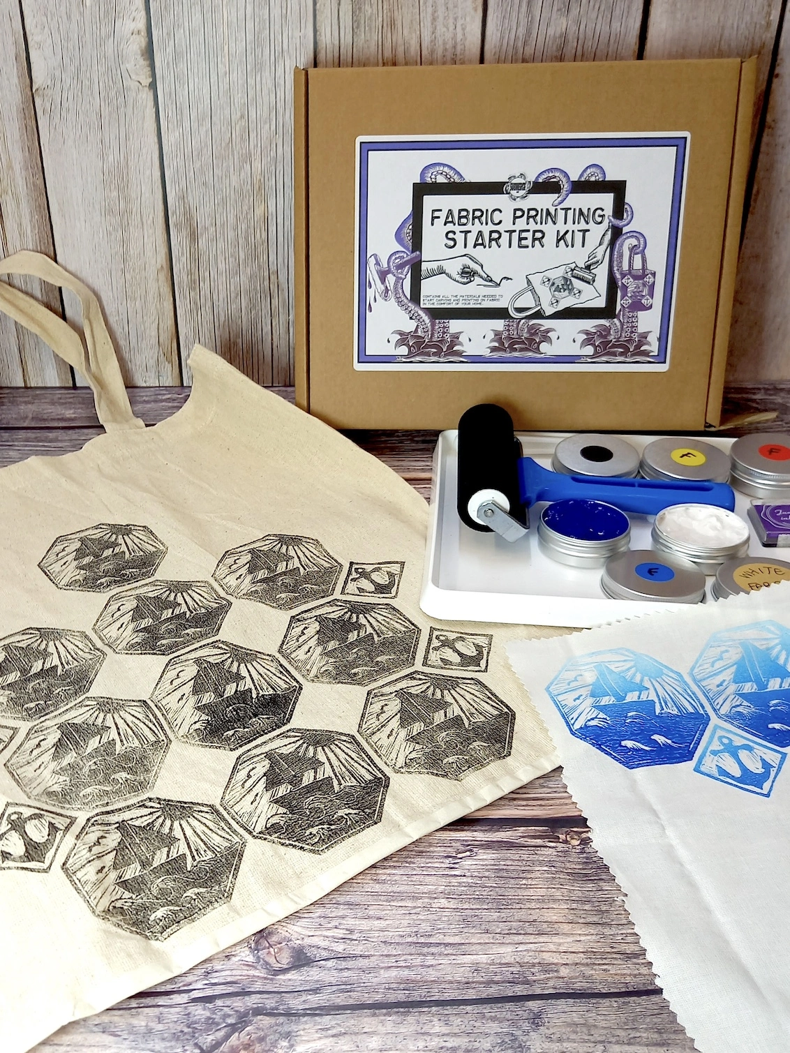 Kit has a blank cotton tote bag for printing your design (and an off cut of cotton to practice on first)