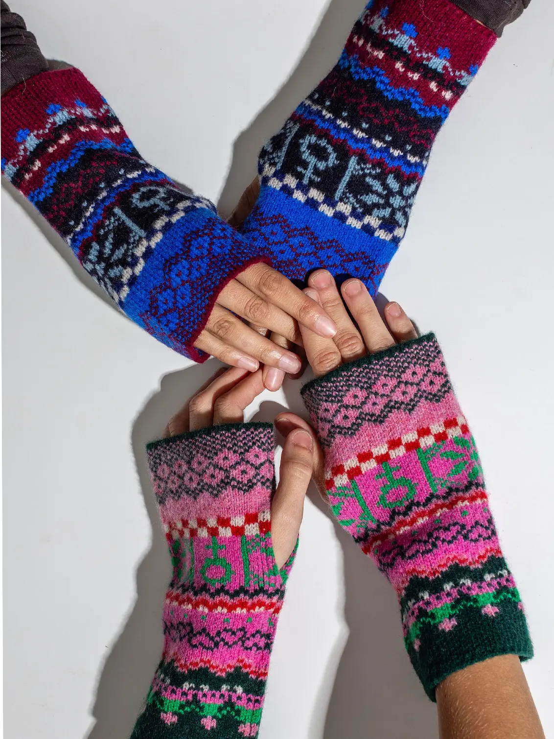 Heritage knit meets modern rebellion. These wristwarmers fuse warmth, history, and feminist energy in a design inspired by Fair Isle traditions and the legacy of wool as women’s work. A contemporary nod to heritage knitwear, they prove that practical can still be radical. Crafted in Scotland by a heritage factory operating since the 1800s, they feature a tubular shape with a discreet thumb slit for everyday comfort. Knitted in five colours to complement our waistcoats, scarves, and gloves, they’re made from soft, breathable merino lambswool spun in Yorkshire — timeless, versatile, and made to last..