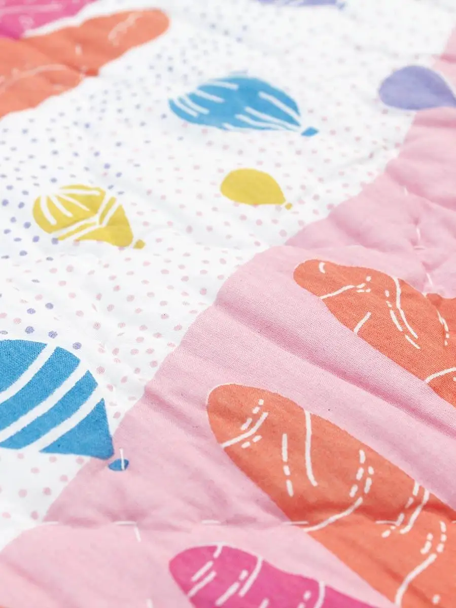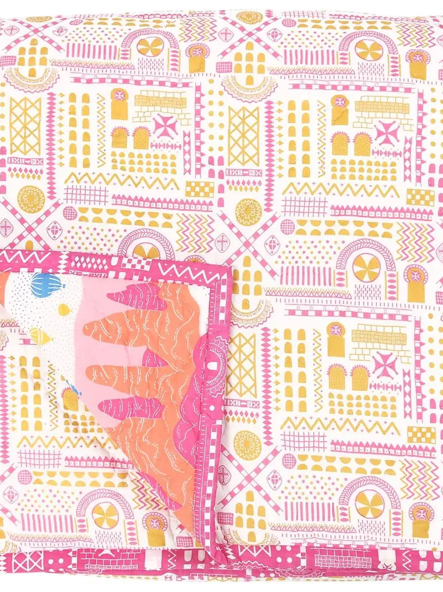 Make your bedroom a bright and happy place with this hand printed, hand quilted bedspread illustrating hot air balloons floating over fairy chimneys inspired by our travels in Cappadocia, Turkey. With a geometric pink and yellow pattern on the other side...