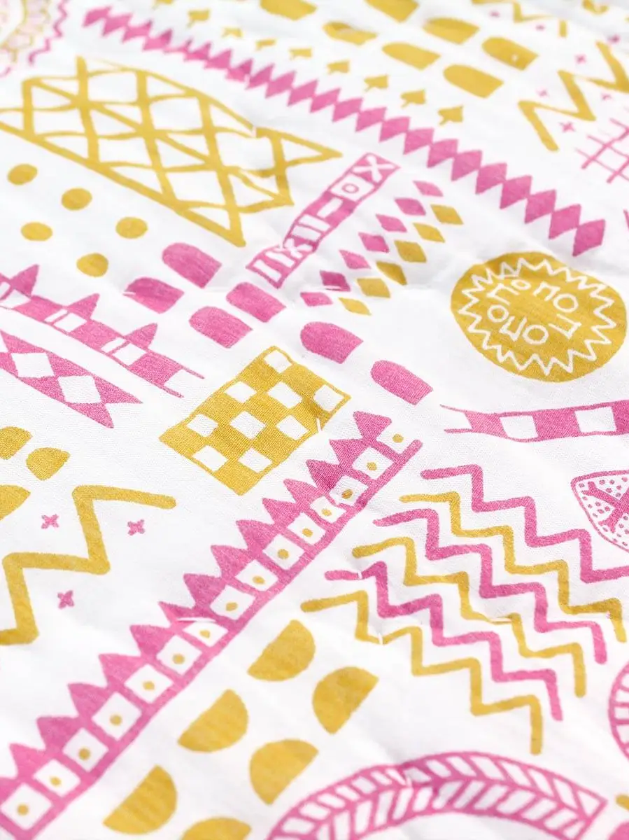 Make your bedroom a bright and happy place with this hand printed, hand quilted bedspread illustrating hot air balloons floating over fairy chimneys inspired by our travels in Cappadocia, Turkey. With a geometric pink and yellow pattern on the other side it will look fabulous whichever side you choose to use!