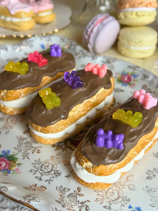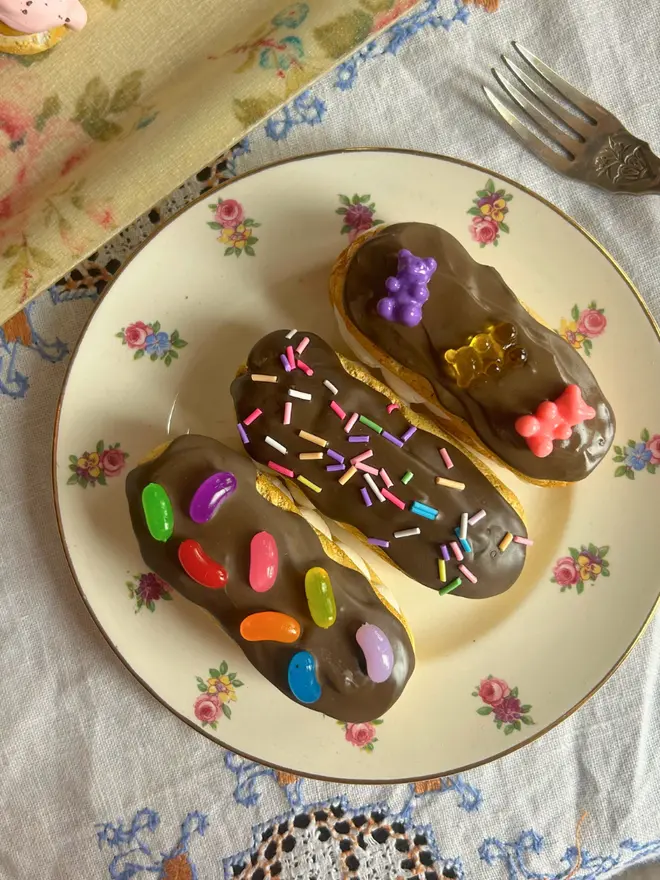 Two layers of fake choux pastry, filled with whipped replica cream and topped with your favourite sprinkles, sweets and fruits.