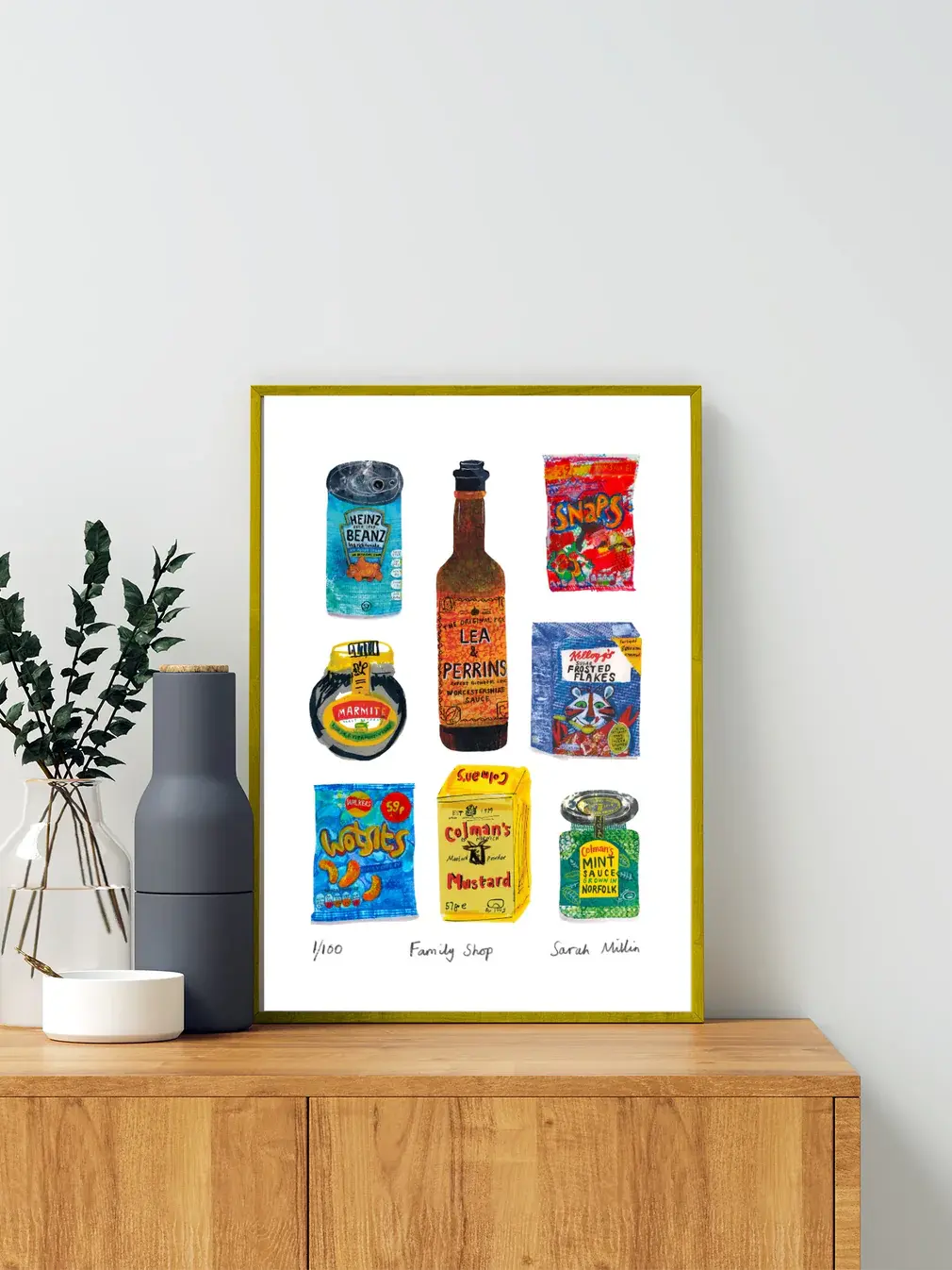 Family Shop features Heinz Baked Beanz, Lea and Perrins Sauce, Snaps, Kellogg’s Frosted Flakes, Walkers Wotsits, Colman’s Mustard and Colman’s Mint Sauce. A custom product produced from hand created mixed-media artwork.