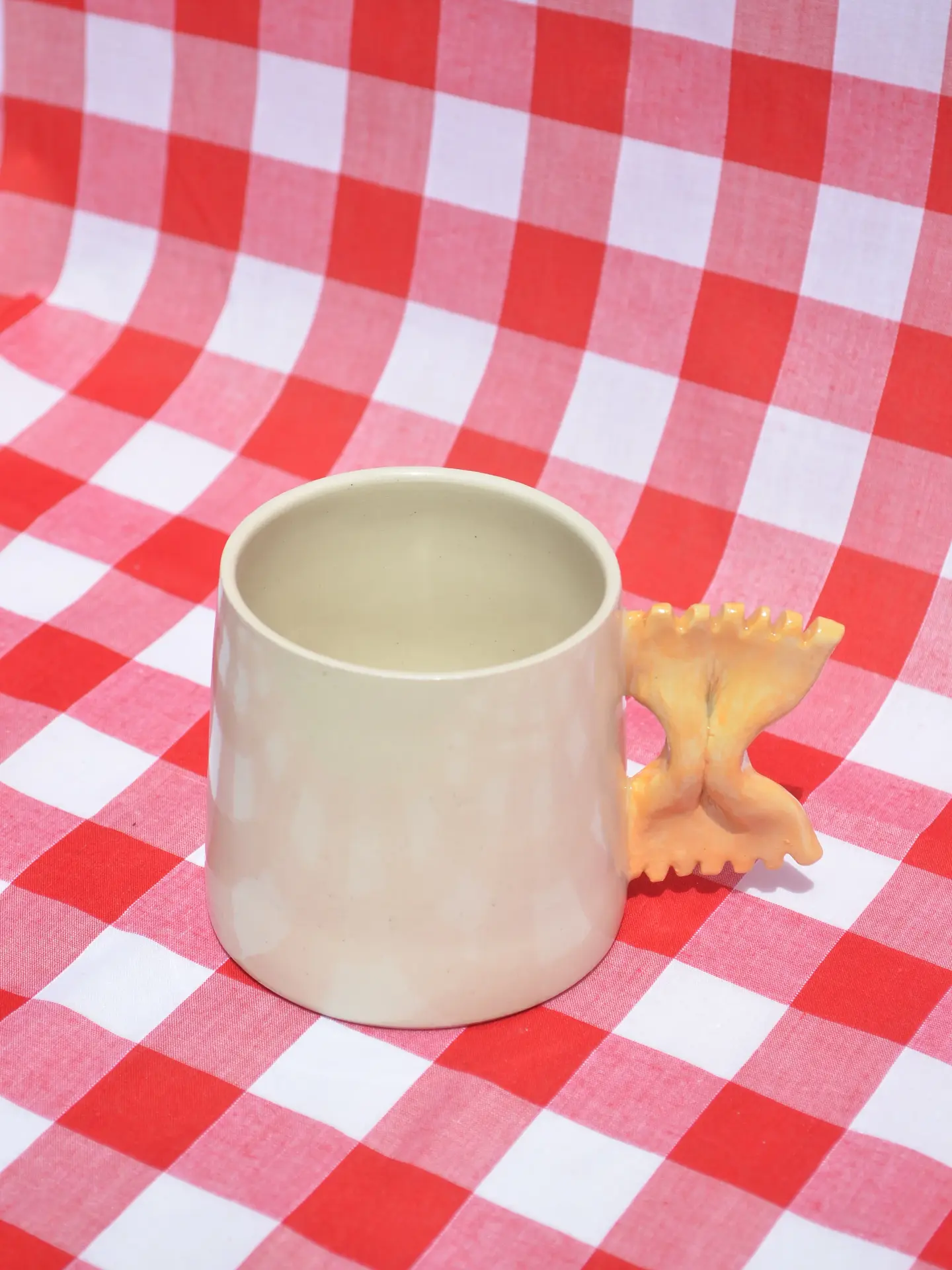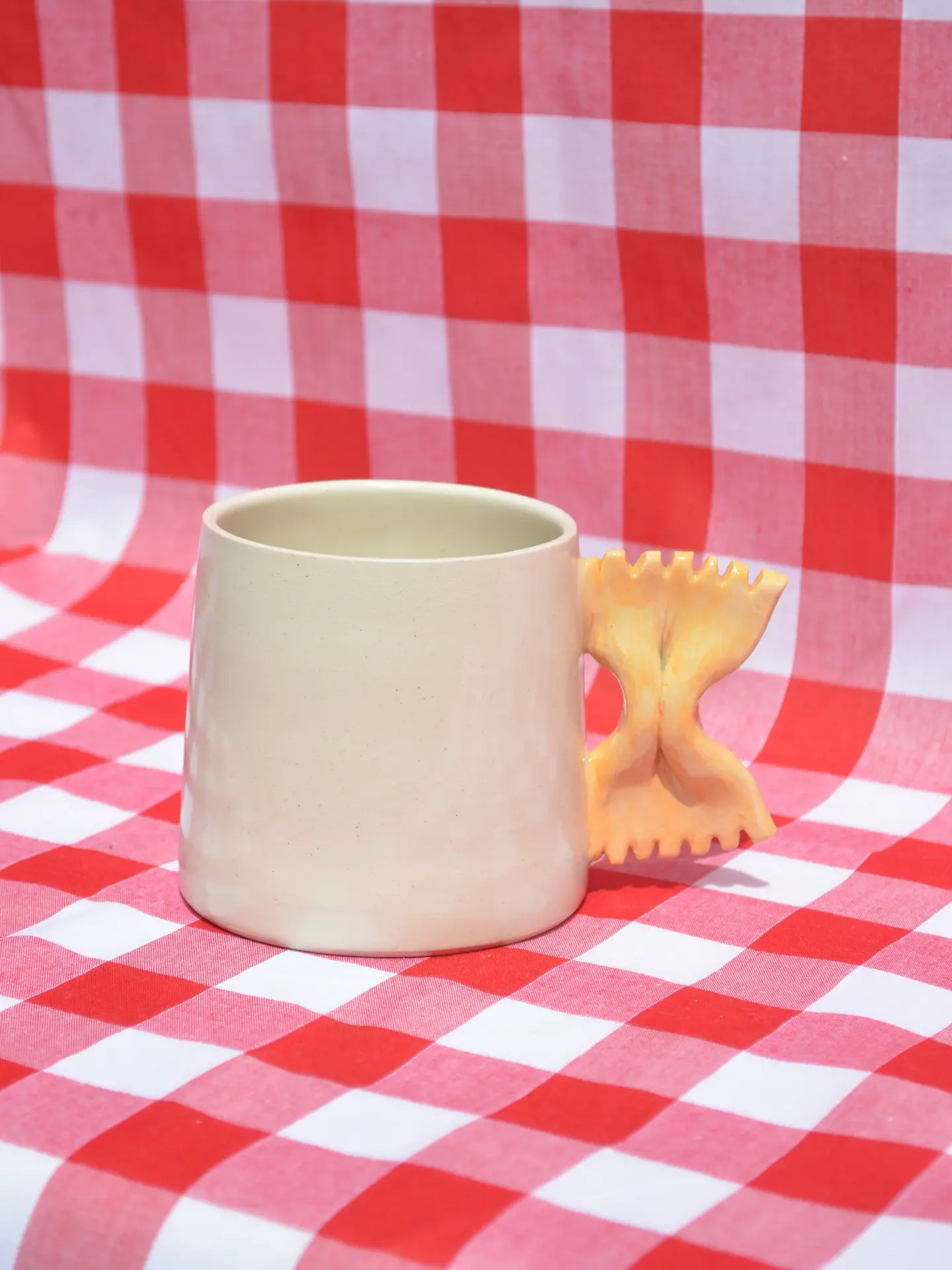 Delight in your cappuccino or americano with this handmade cup featuring a handle shaped like a farfalle pasta.