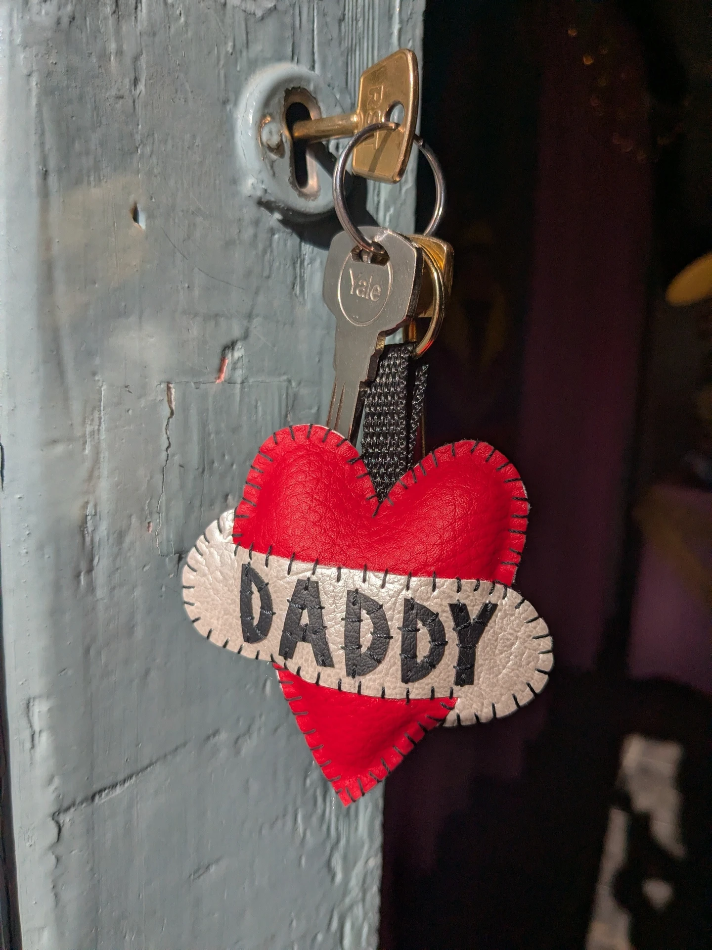 Made from vegan friendly faux leather, with red faux leather reverse and a label that says "Love From Hetty & Dave". A black loop at the top holds a brass split ring.