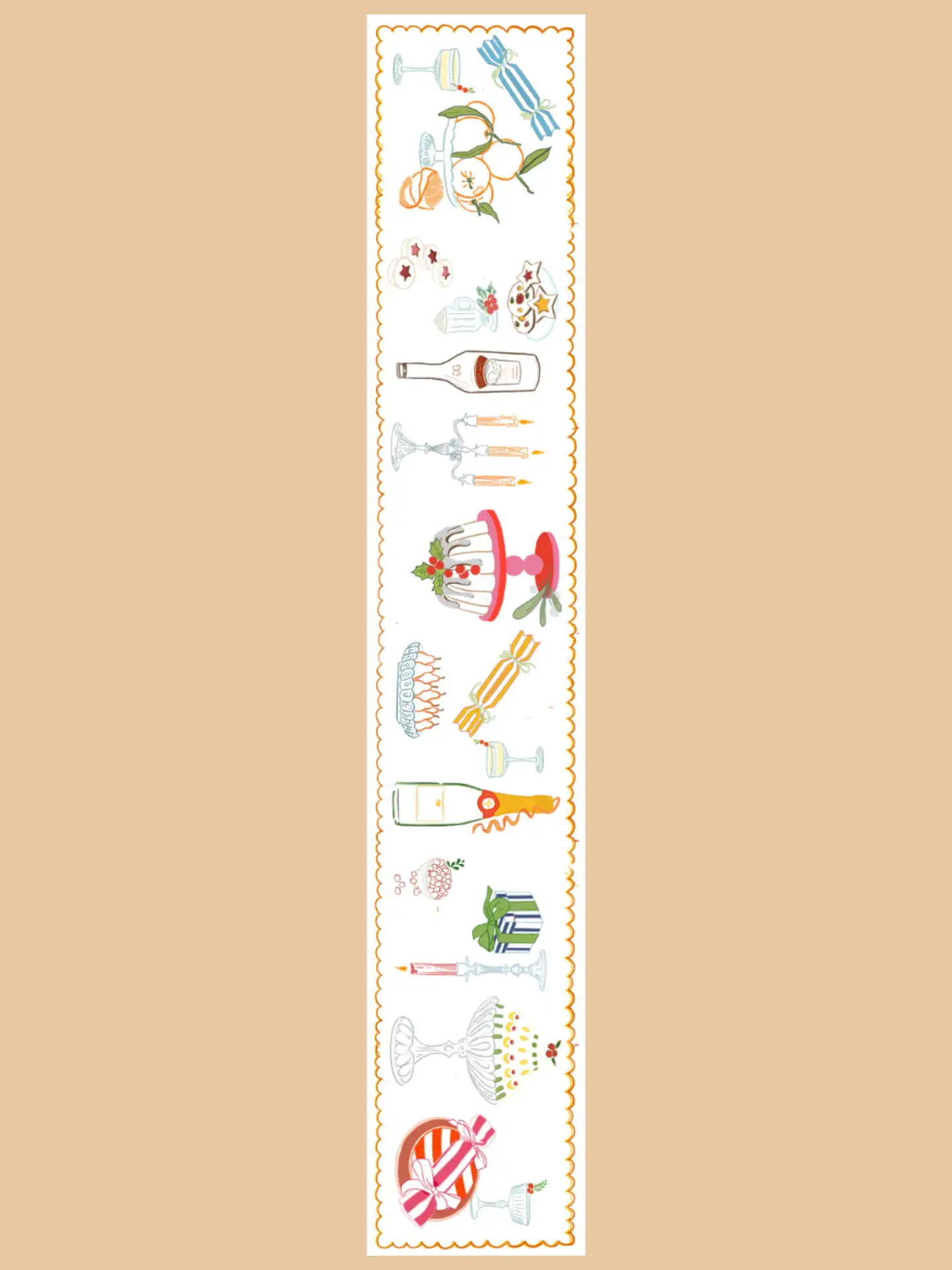 The Jacksons hand-embroidered table runner featuring festive objects from jelly and pears to champagne and candelabras!...