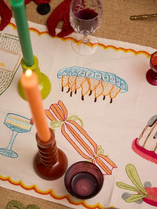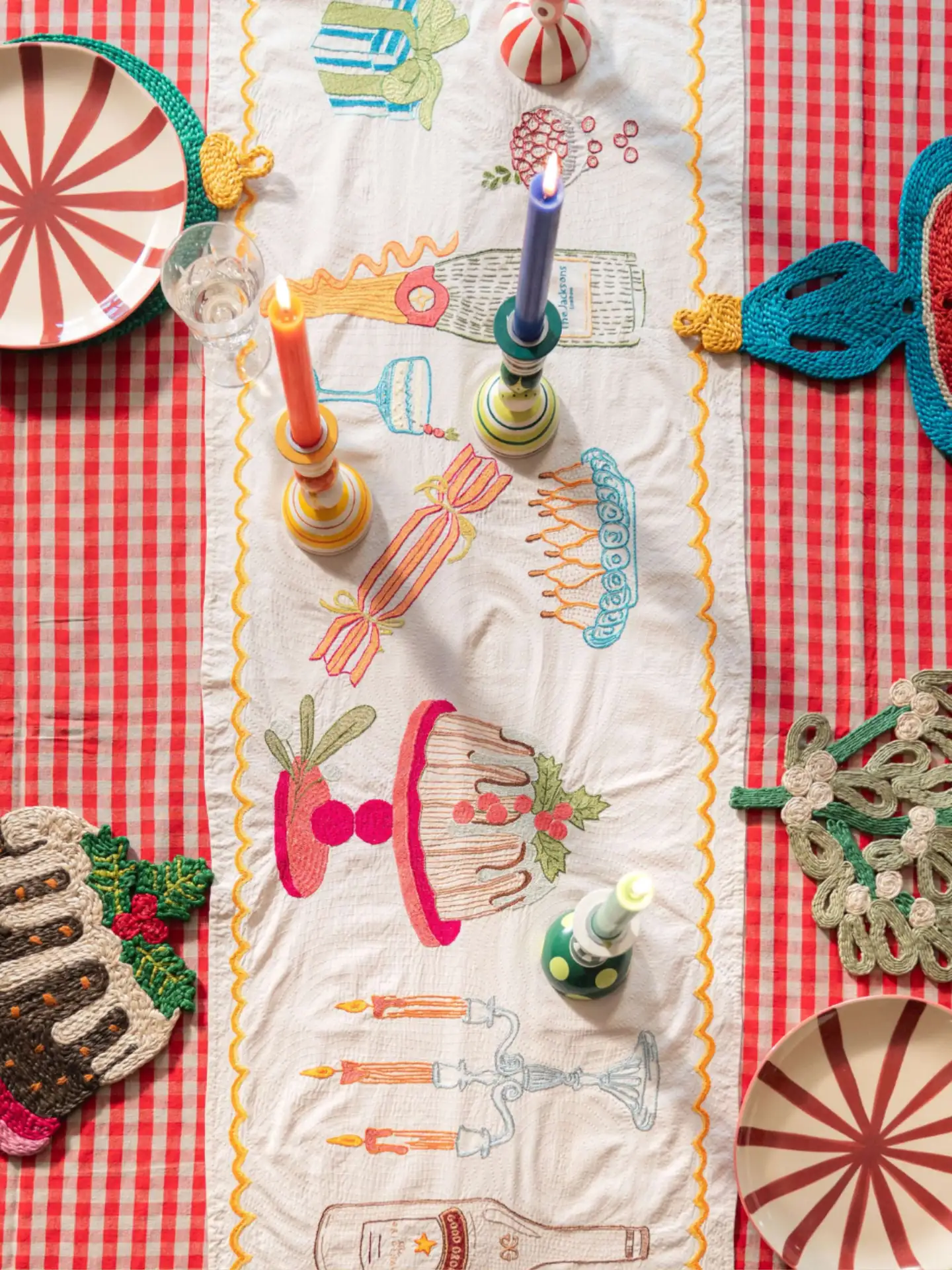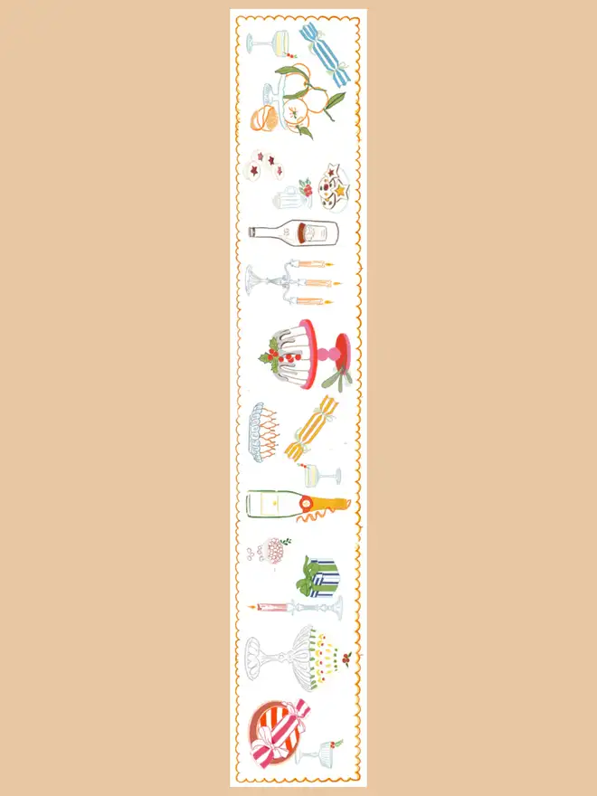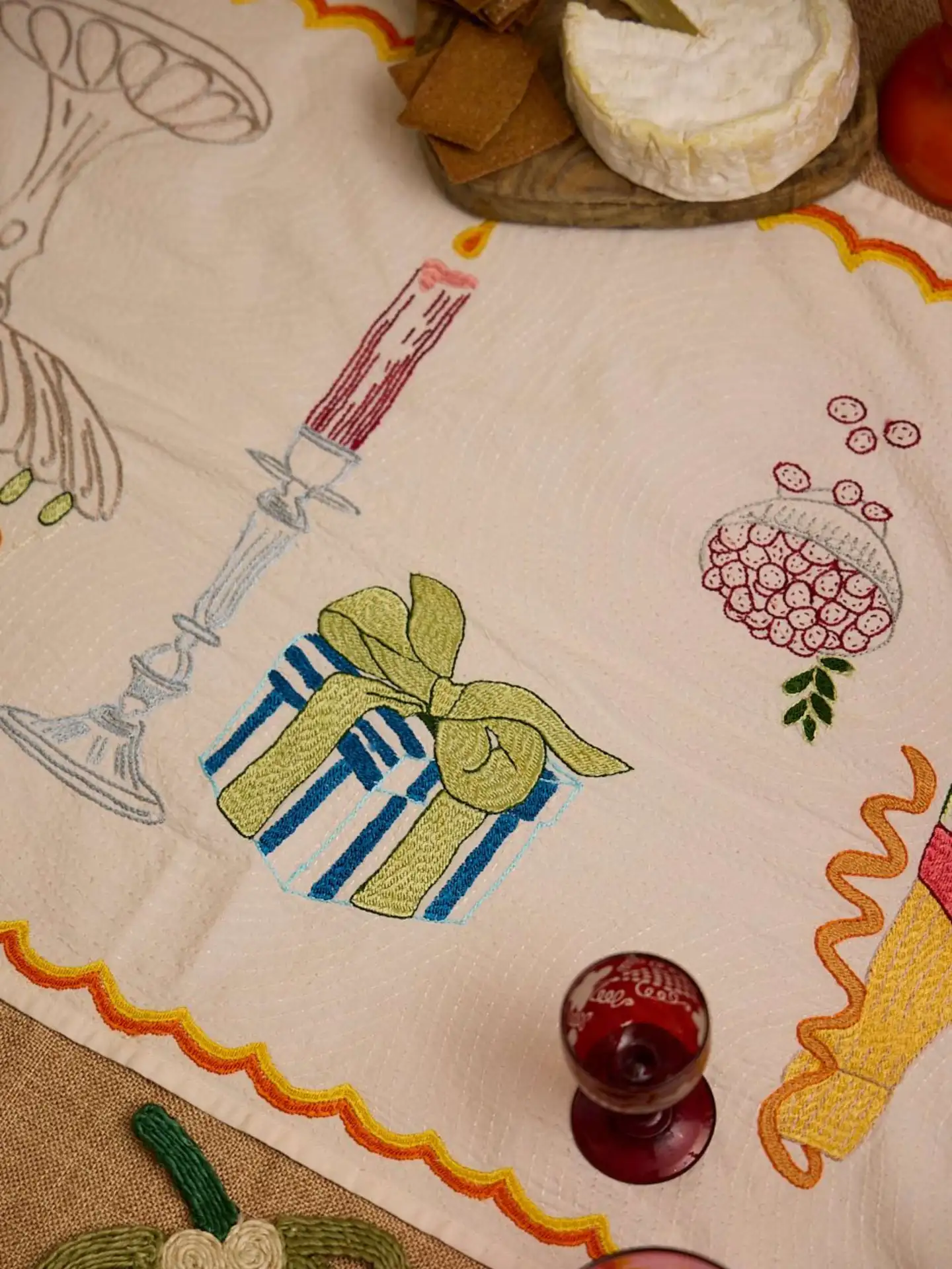 The Jacksons hand-embroidered table runner featuring festive objects from jelly and pears to champagne and candelabras!