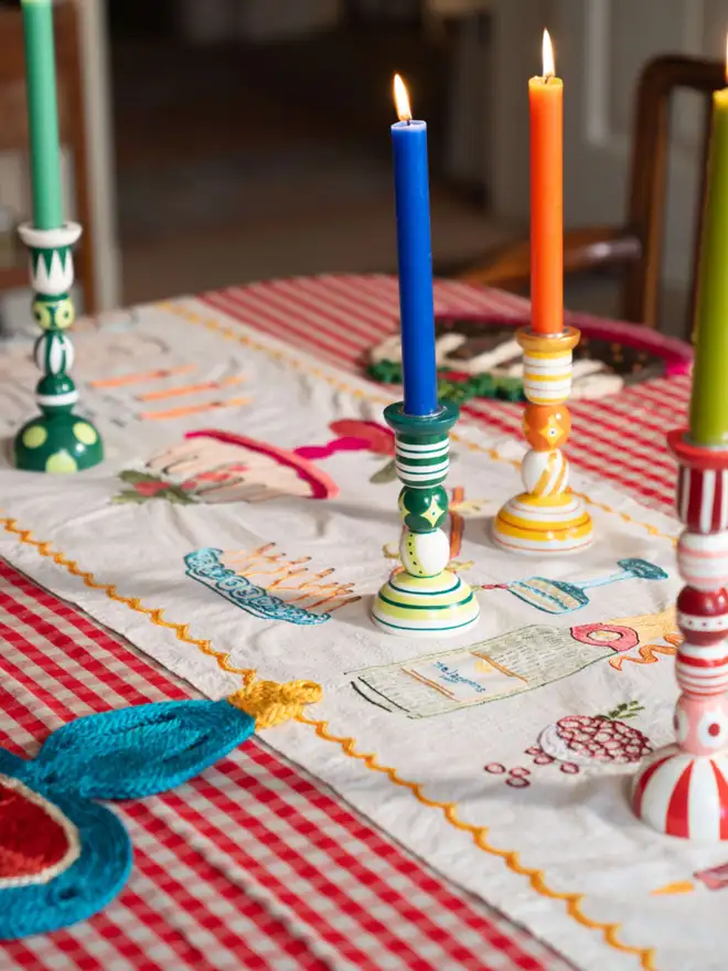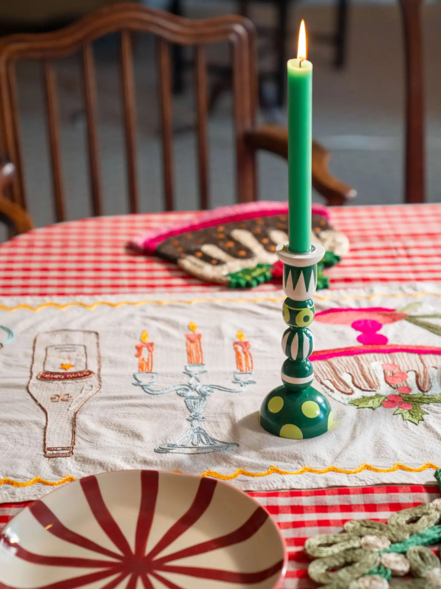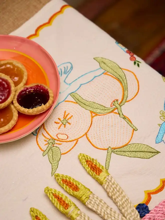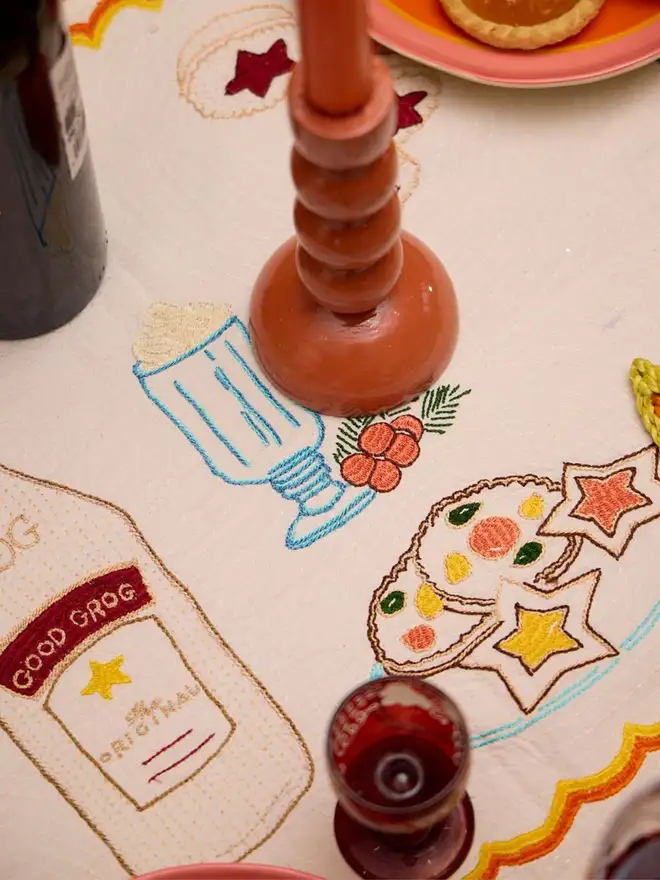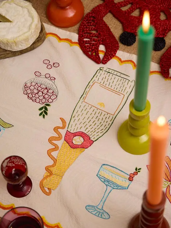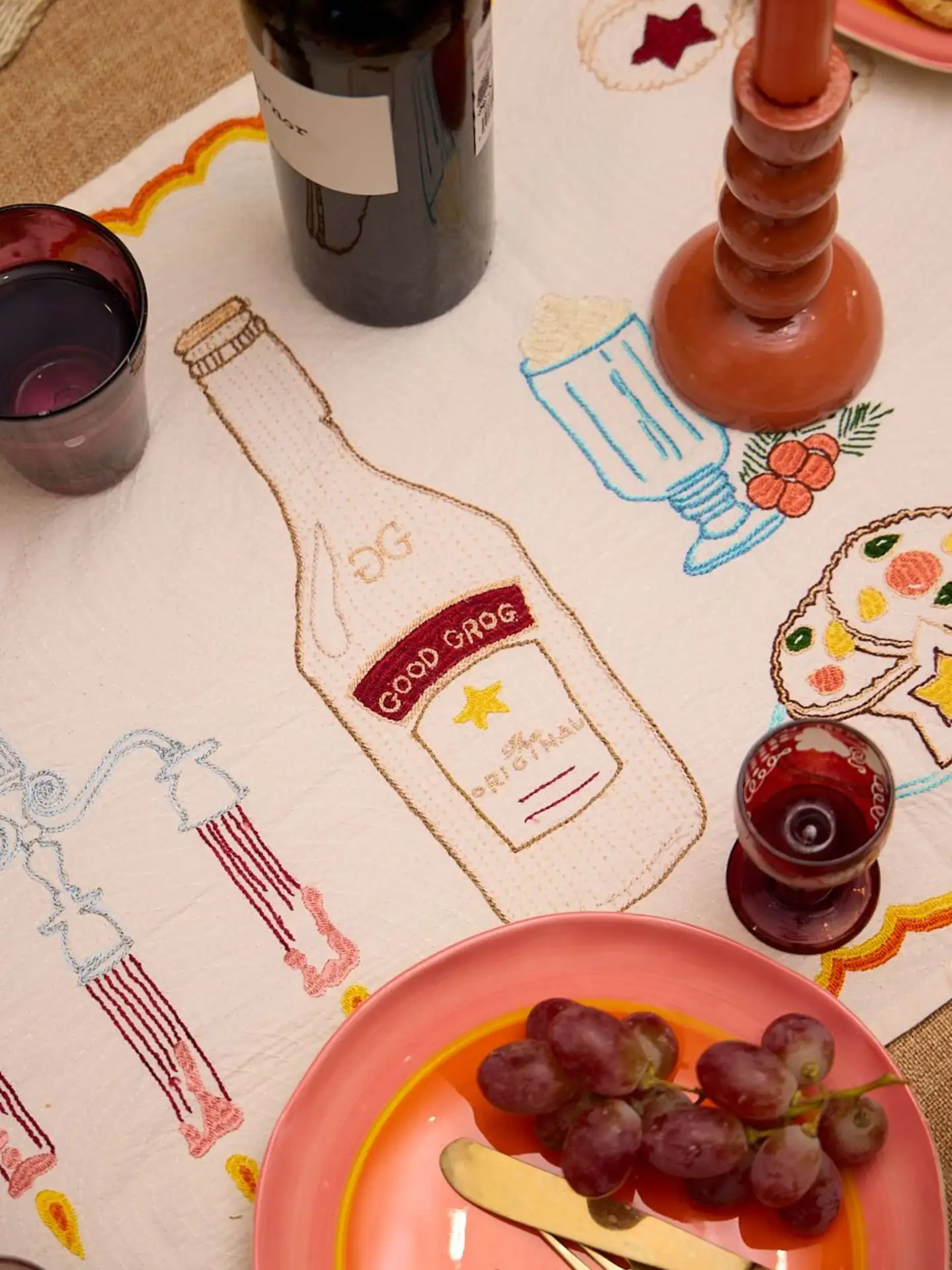 The Jacksons hand-embroidered table runner featuring festive objects from jelly and pears to champagne and candelabras!