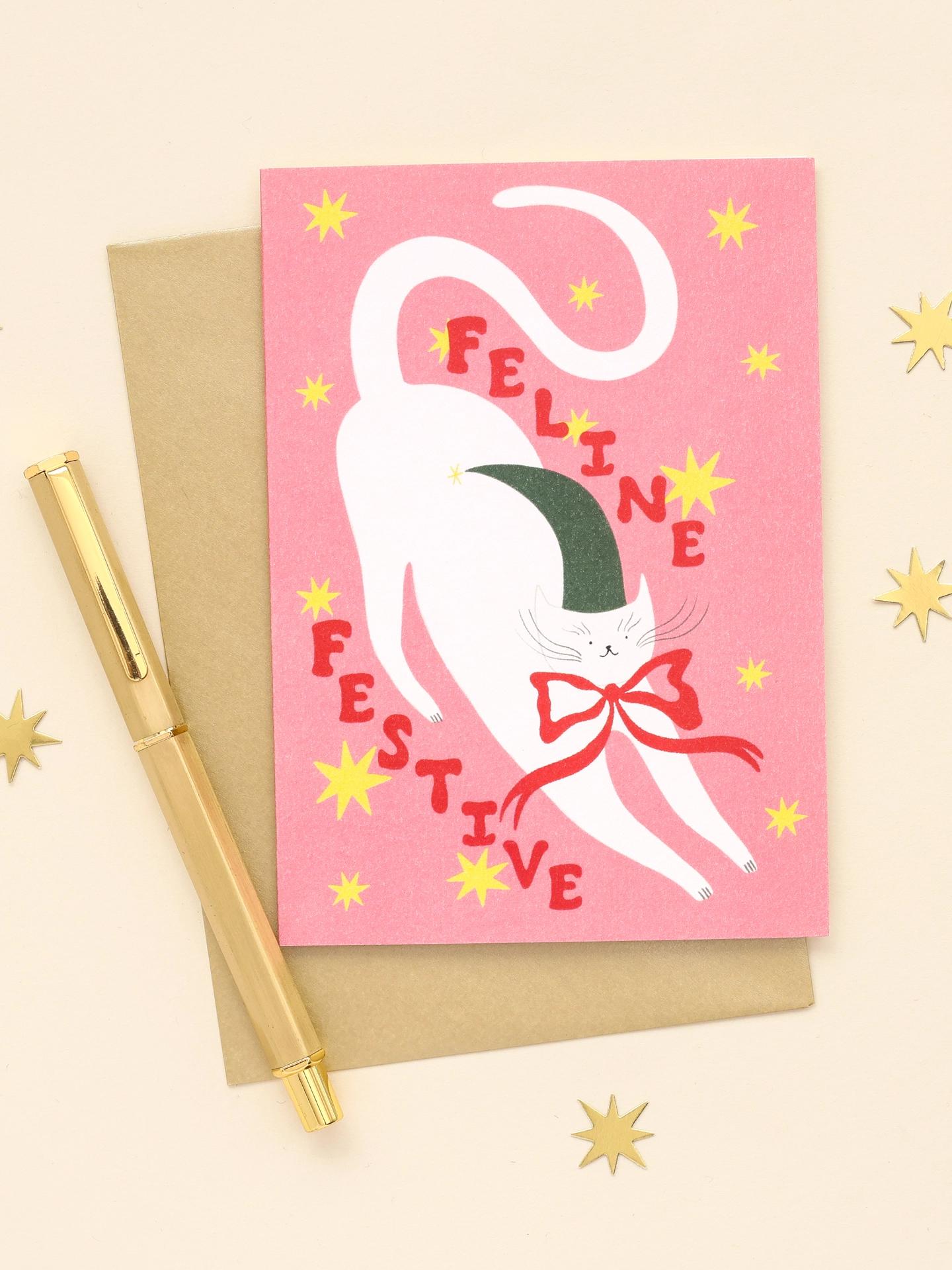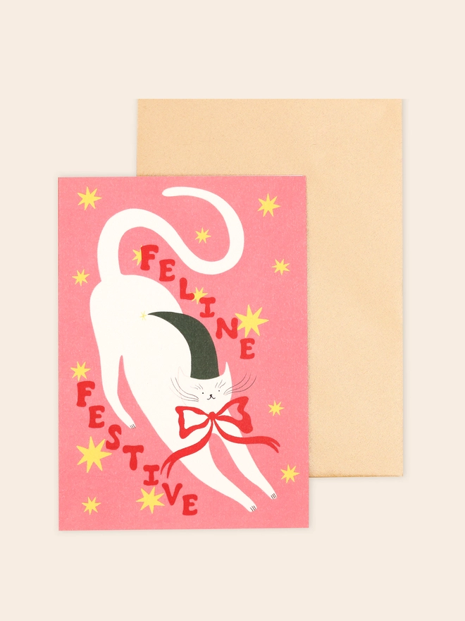 Trendy contemporary Christmas card featuring a stylish white cat on a pink starry background. Text reads 'Feline Festive'.