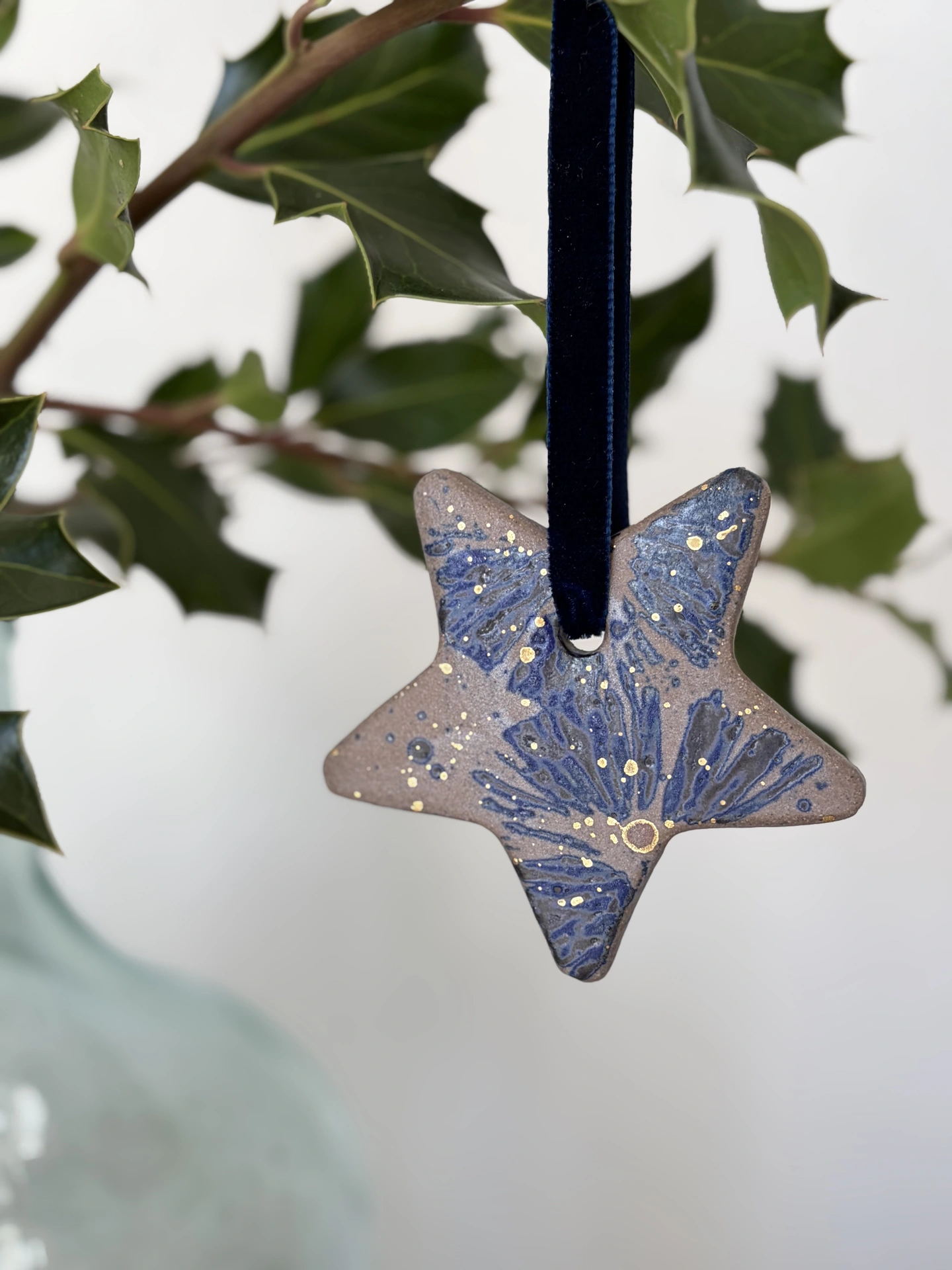 Handmade in a toasty stoneware clay. With hand printed cobalt patterns and 10% real gold lustre flecks. Finished with a navy velvet ribbon for hanging.