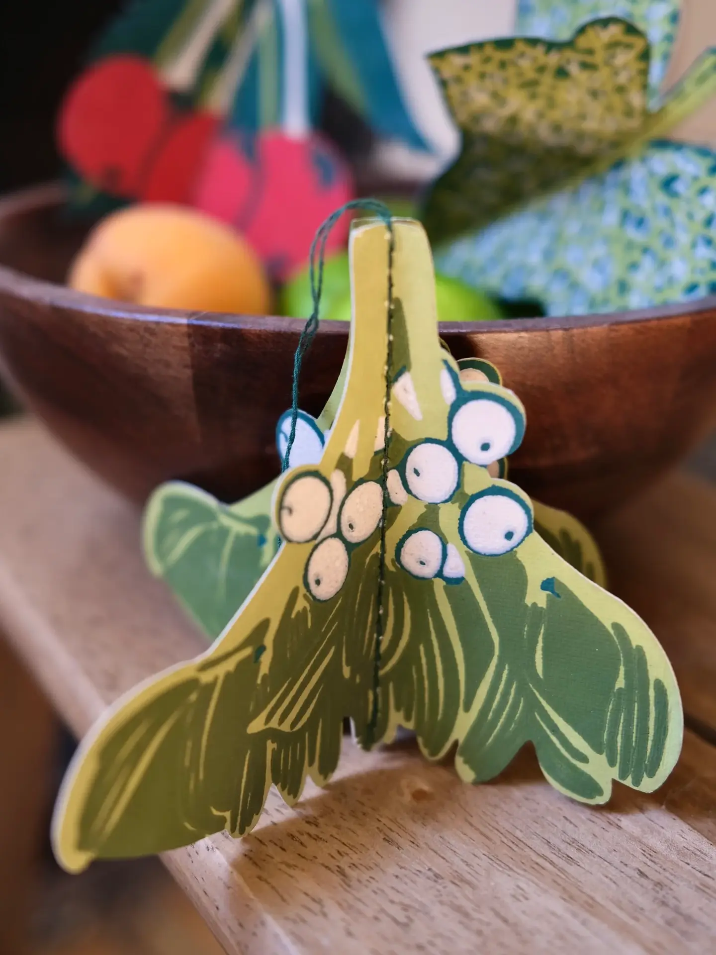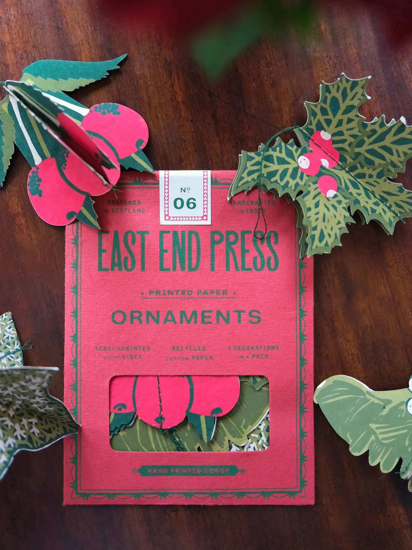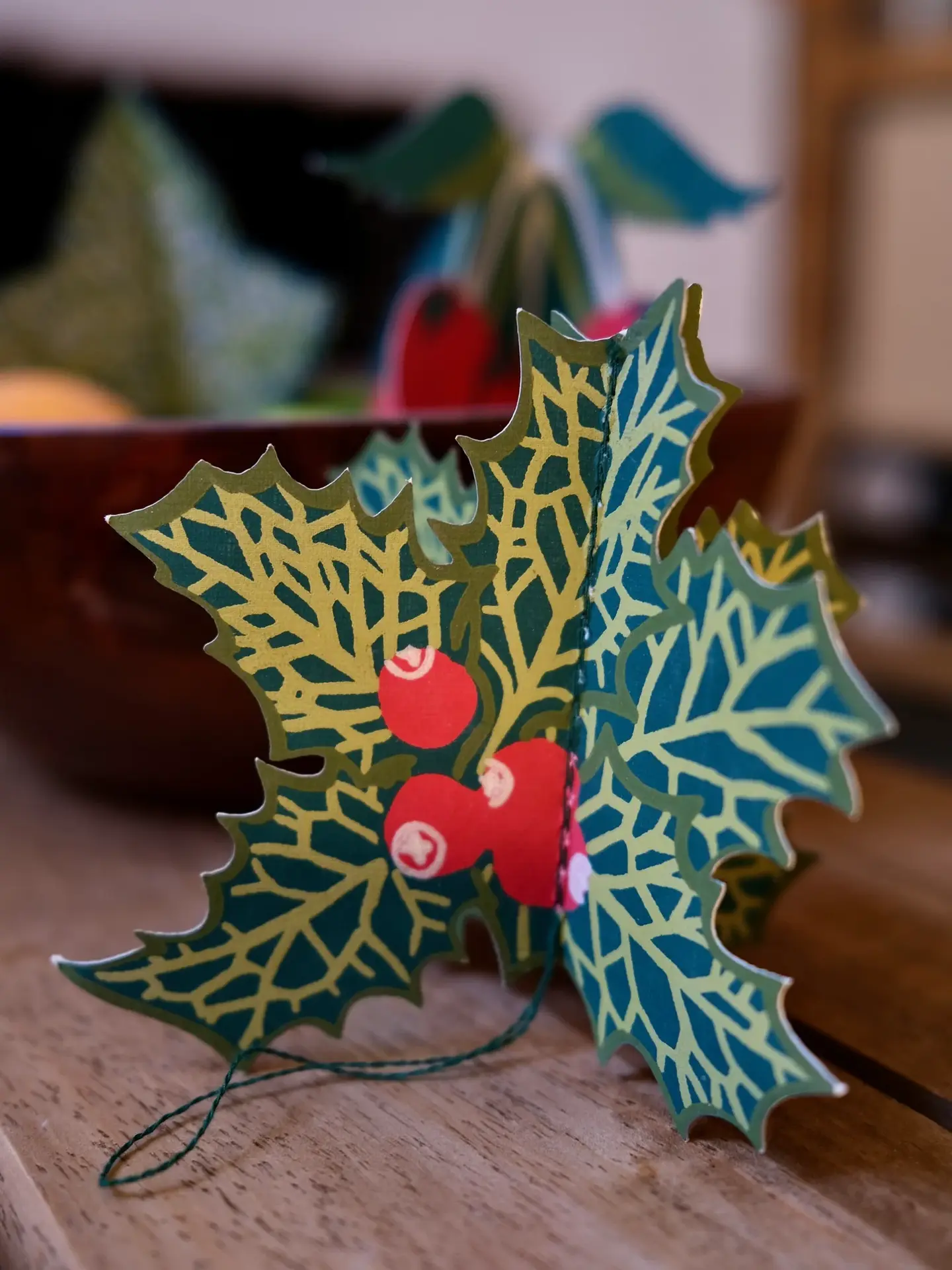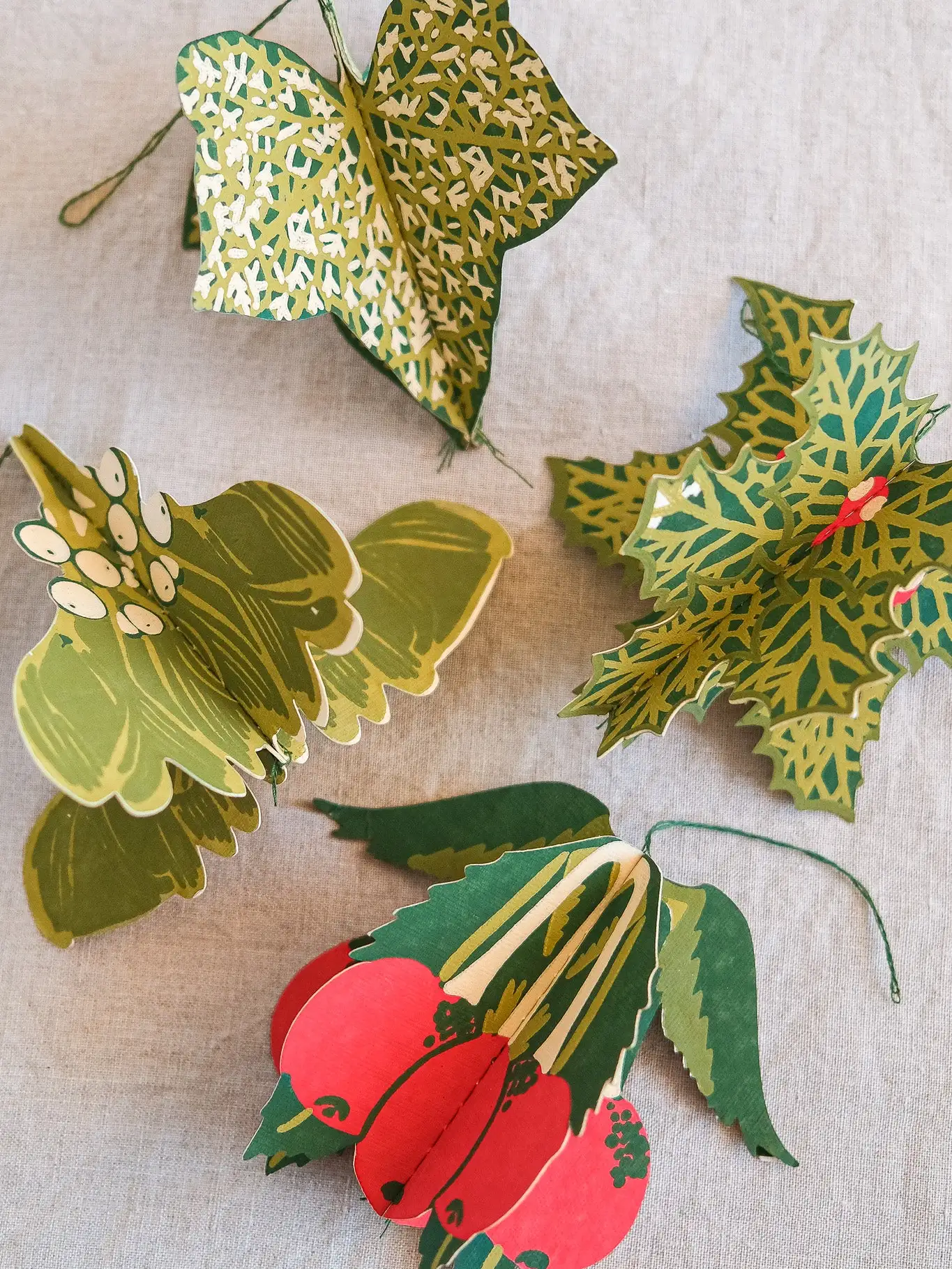 Four traditional festive plants make up this set of fold our paper decorations. Featuring ivy, holly, mistletoe and red berries.