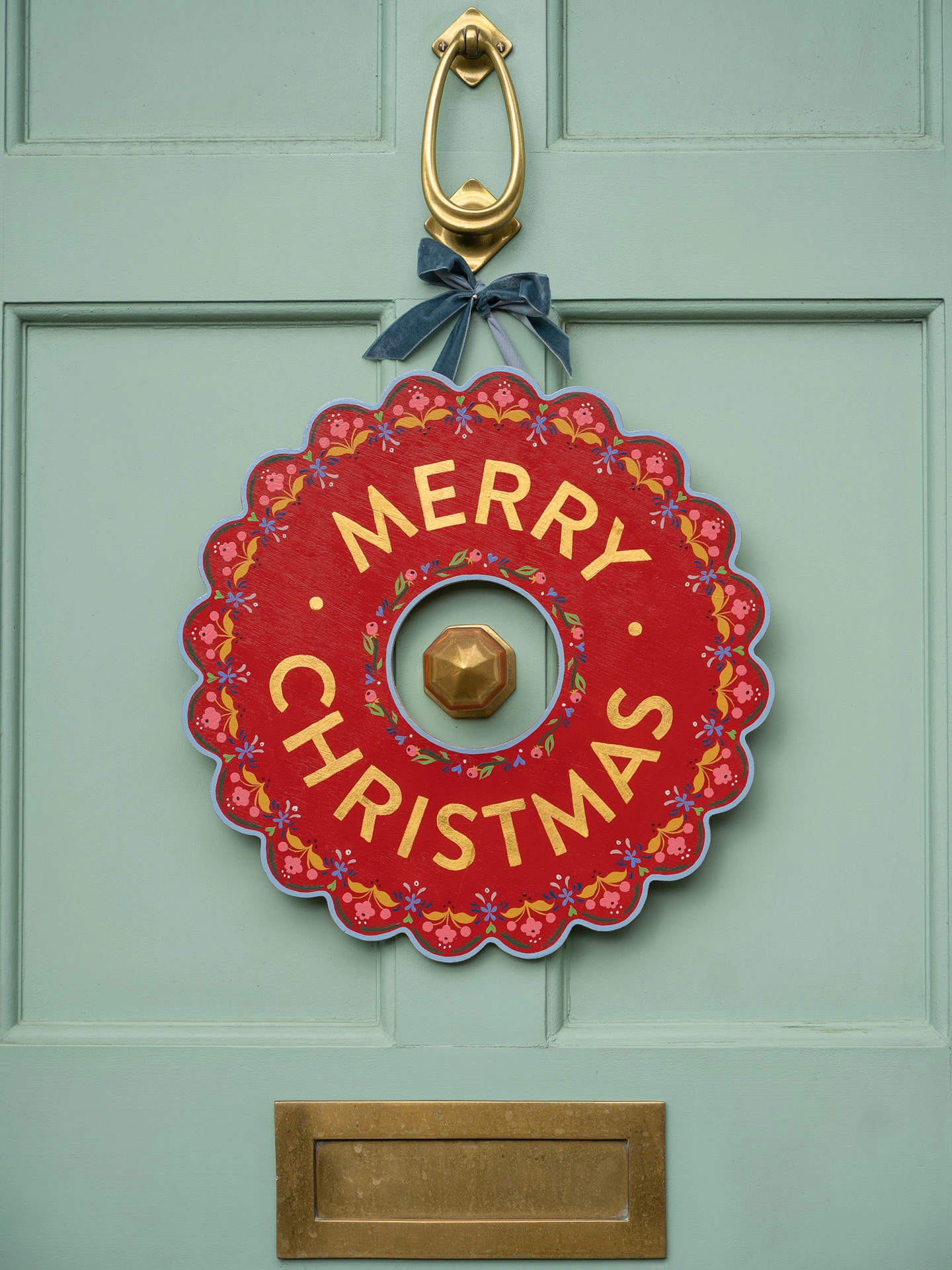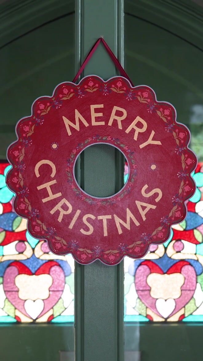A lovingly hand painted, plywood wreath with 24 carat gold leaf lettering. Each wreath is finished with a triple coat of exterior varnish so it can be hung outside in all weathers. There are D-hooks on the back which are felt covered to protect whatever surface you choose to hang your wreath on. All wreaths come with a luxury ribbon for hanging and a hand made dust bag for storing.