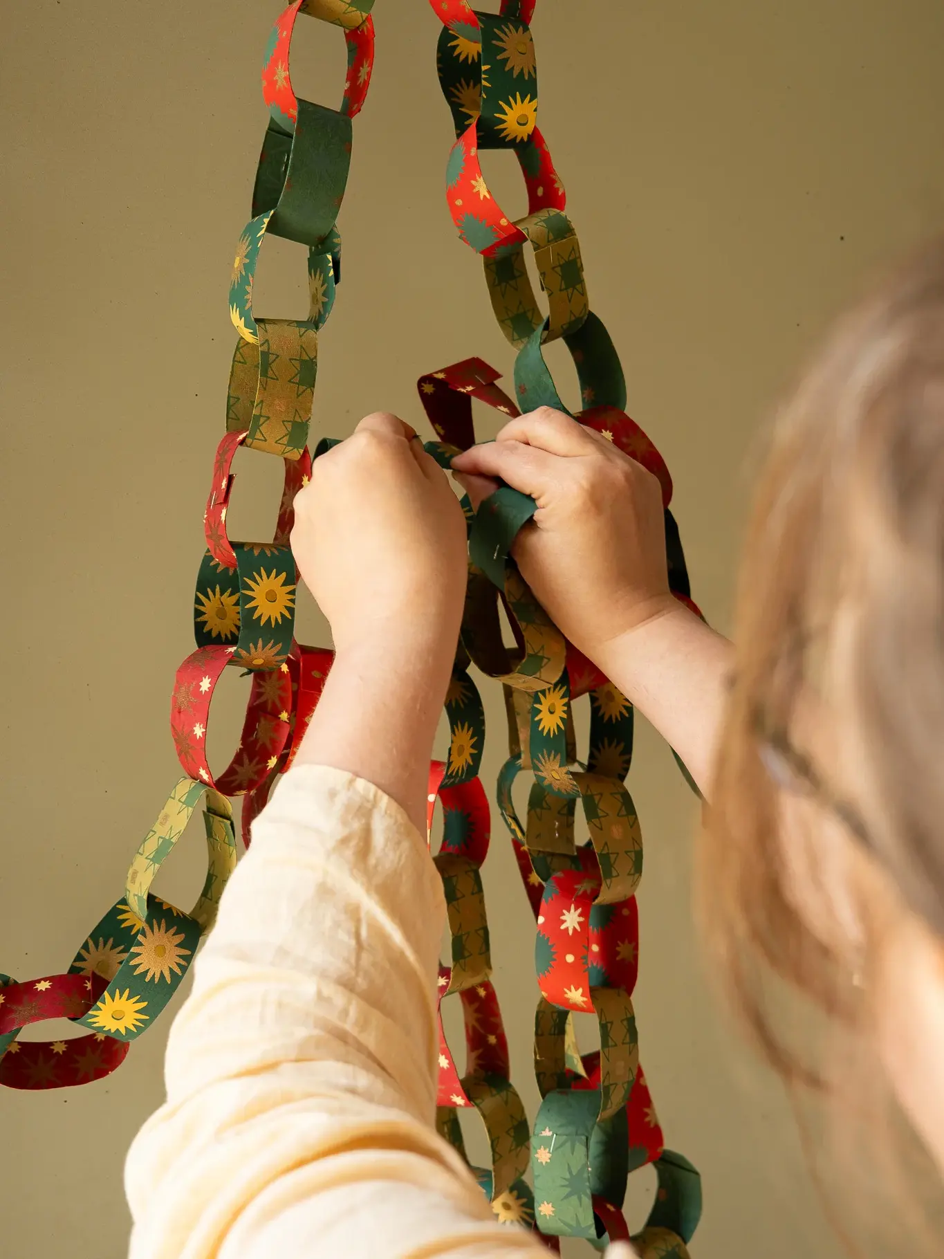 Our paper chain kits contains 160 strips of recycled, multicoloured paper strips which, when assembled, create ten metres of beautiful paper chains.