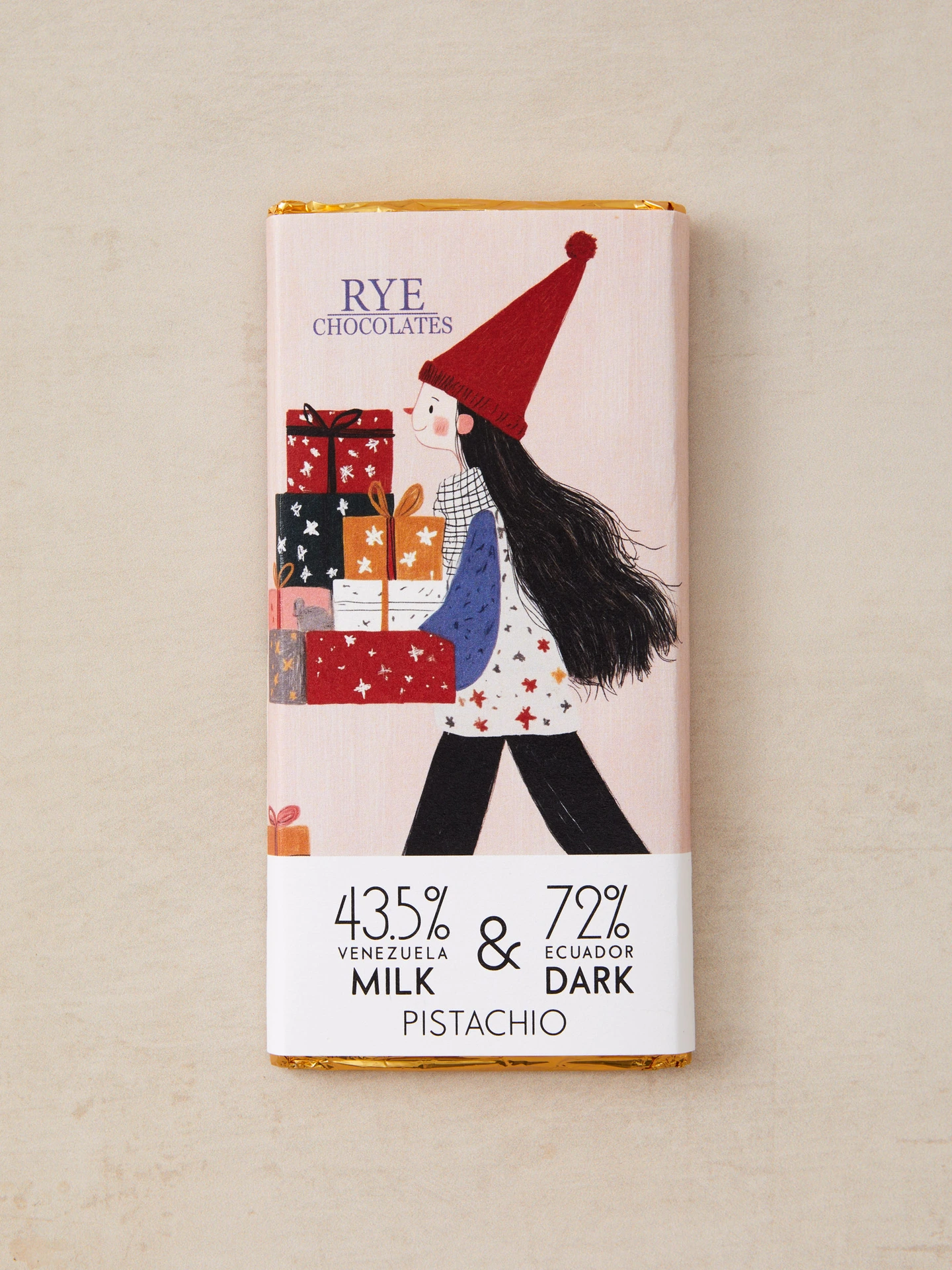 A joyful blend of milk and dark with pistachio - colourful, nutty and celebratory.