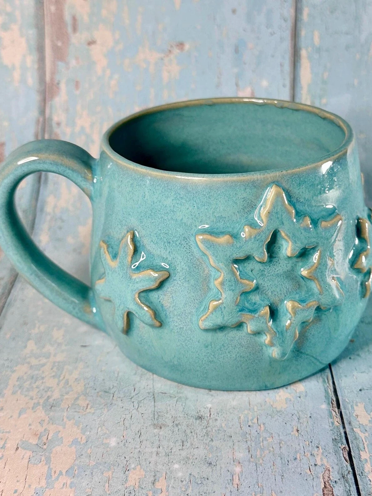 Handmade ceramic mug, one of a kind, with a glaze and decorated with snowflakes. Available in 2 stunning colours: turquoise blue and white.
