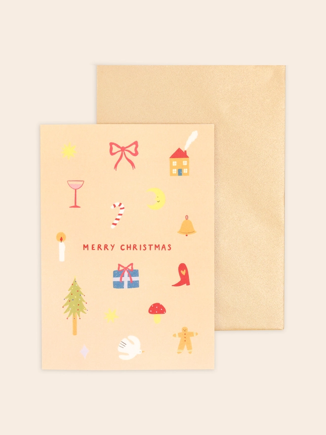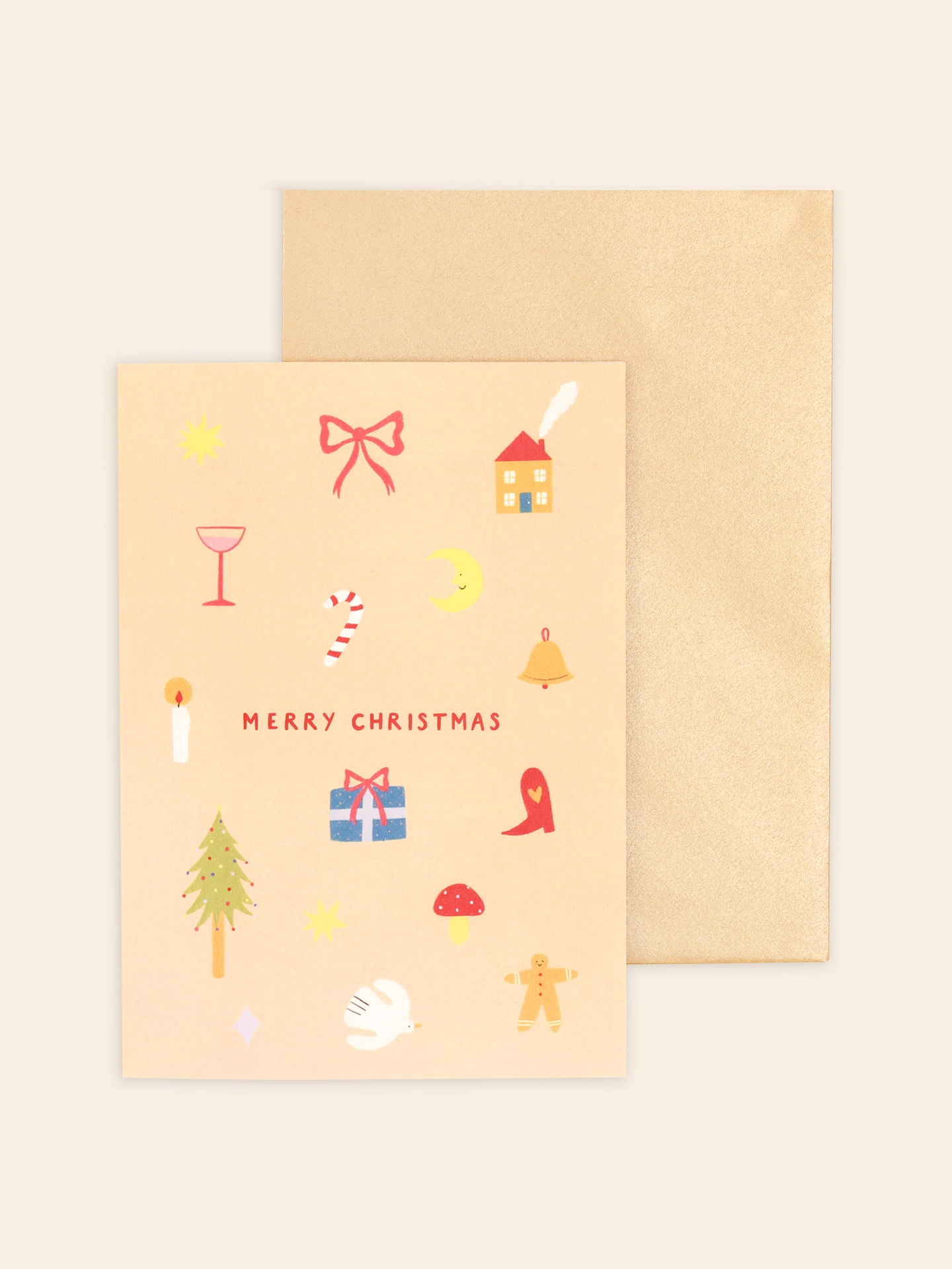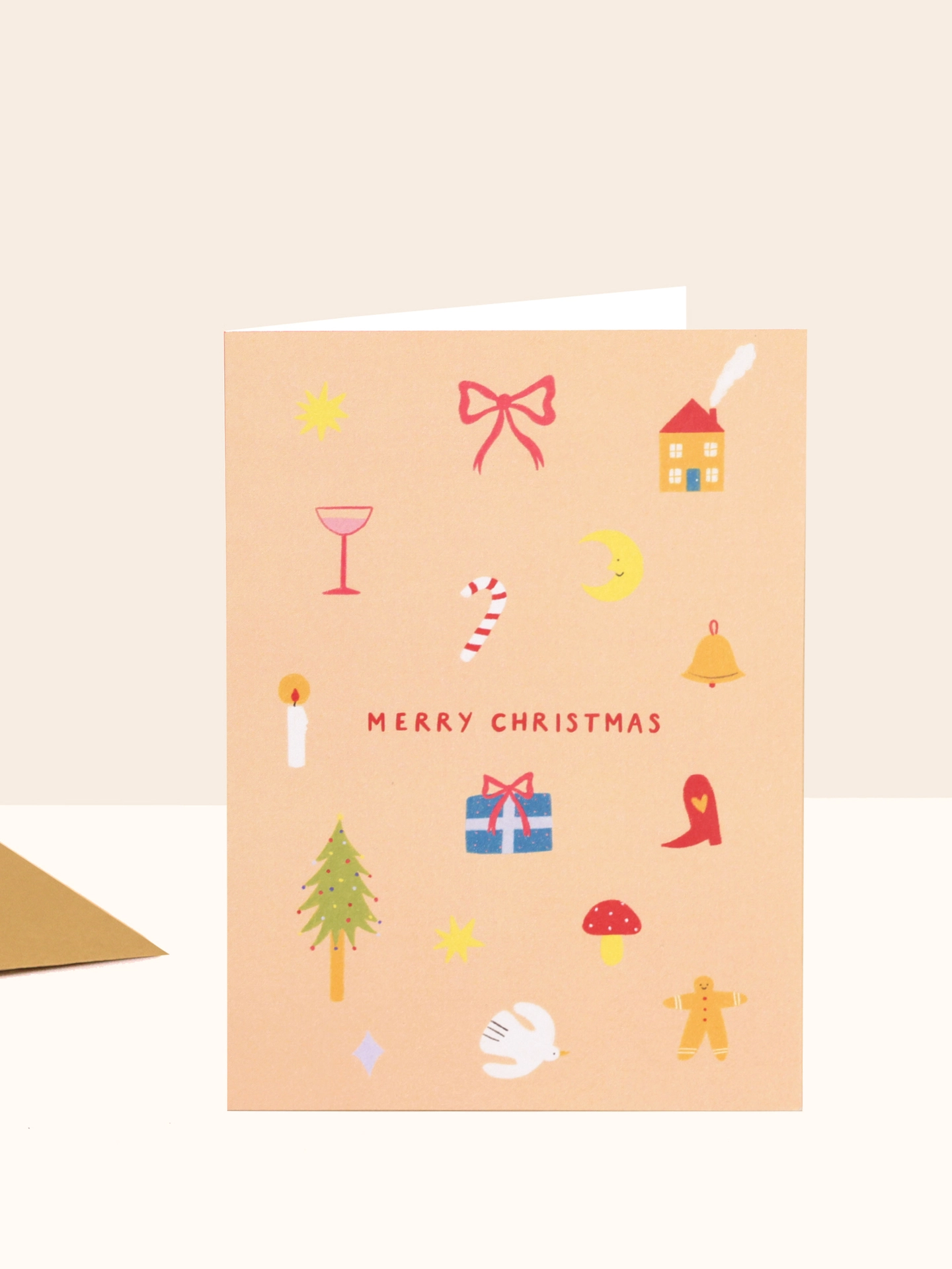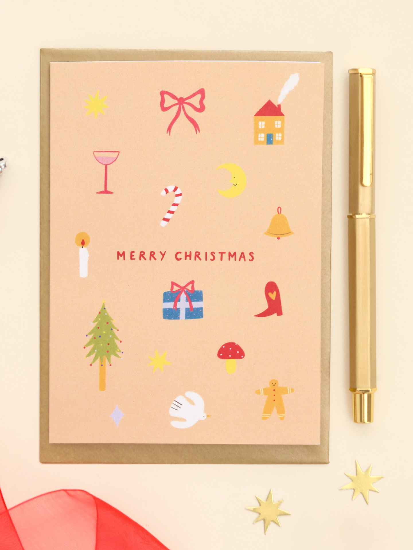 Christmas card featuring little illustrated trinkets including moon, tree, cowboy boot, bell and present. The perfect Christmas card to gift friends, colleagues and family. Illustrated with a contemporary colour palette with a peach background.