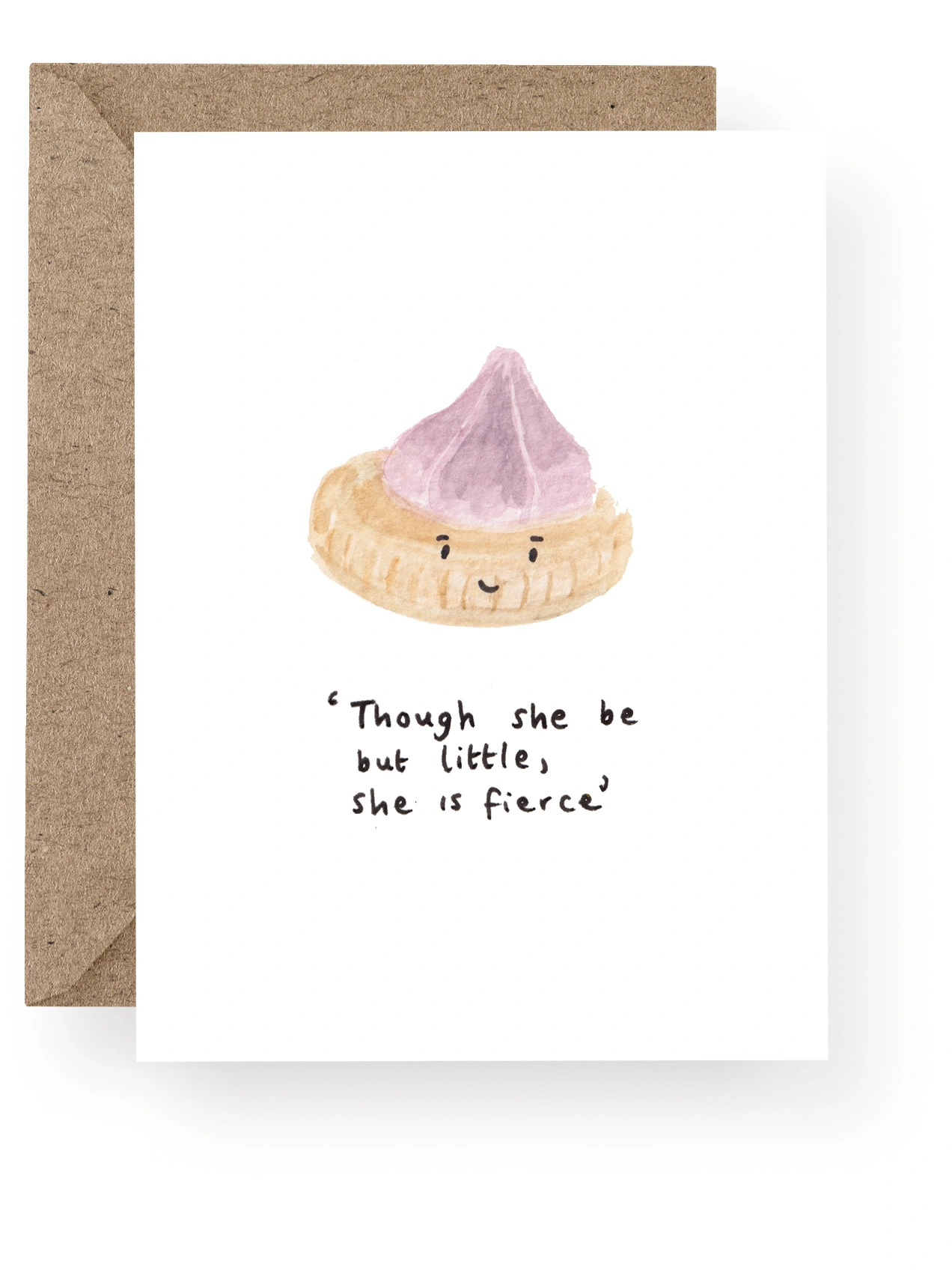 The Card reads 'Though she be but little, she is fierce' and features a watercolour illustration of a pink iced gem.