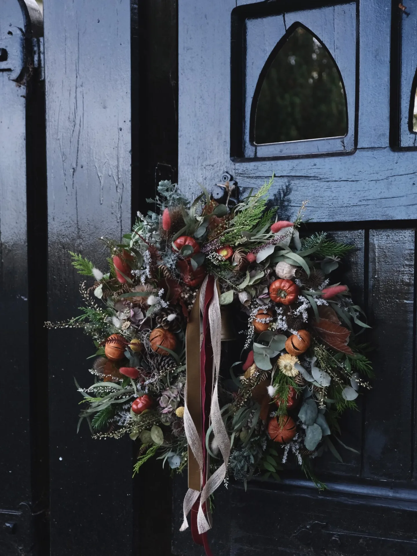 Designed on a straw wreath frame, eco friendly and long-lasting! Packed with many elements and materials to create a truly unique seasonal door design!