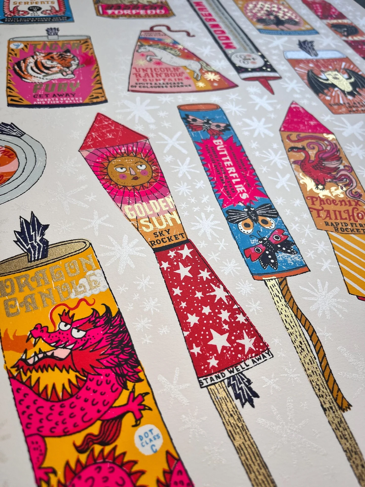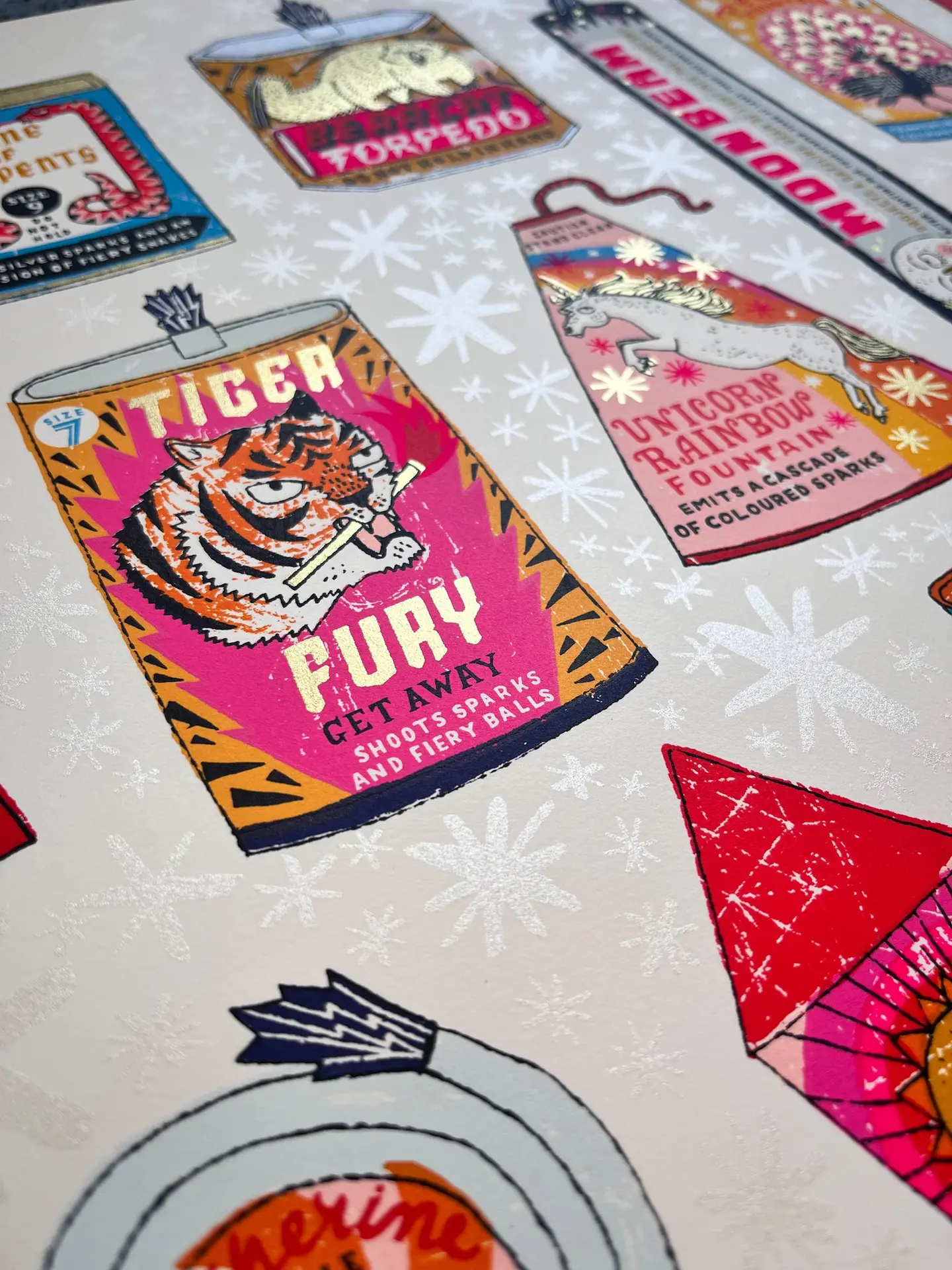 A handmade screen print of a magnificent collection of 23 slightly made up fireworks - but ones you'd definitely want to set off on special occasions! Who wouldn't want to gasp in awe at the Unicorn Rainbow Fountain (and that unicorn has hooves of gold) o...