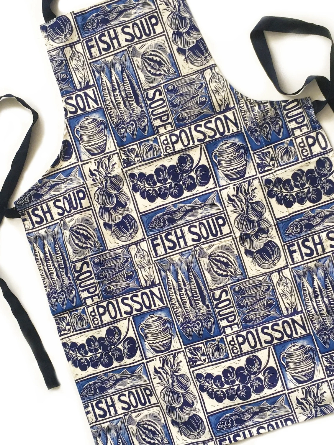 High quality unbleached organic cotton apron, screen printed with my unique system of linocut illustrated recipes - each image is an ingredient, the complete design is the recipe - the cooking instructions come on the packaging - everything you need to make this delicious old family favourite - a Fish Soup from the Occitanie region of France - where I spent the summers of my childhood.