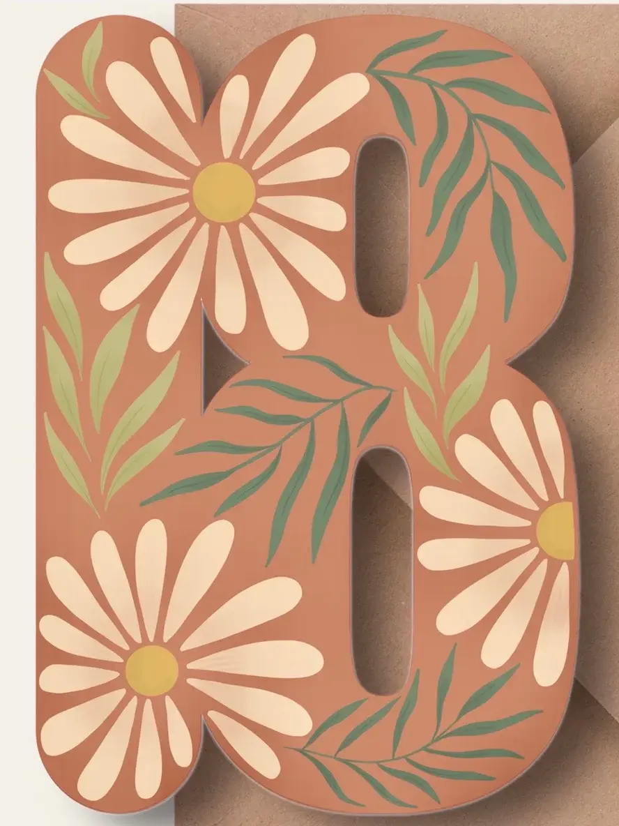 Celebrate a milestone with our unique 18th birthday greeting card, creatively cut in the shape of the number '18'. Adorned with a modern floral design featuring cheerful daisies, sunflowers and other botanicals in warm pinks, yellow and red hues, this A6...