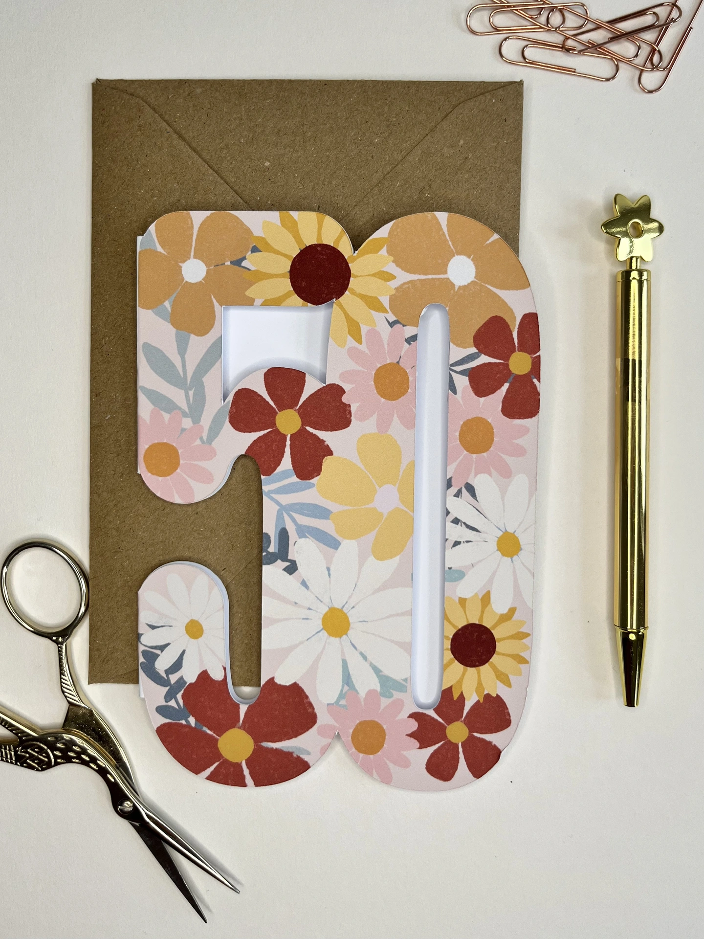 Celebrate a milestone with our unique 50th birthday greeting card, creatively cut in the shape of the number '50'. Adorned with a modern floral design featuring cheerful daisies, sunflowers and other botanicals in warm pinks, yellow and red hues, this A6...