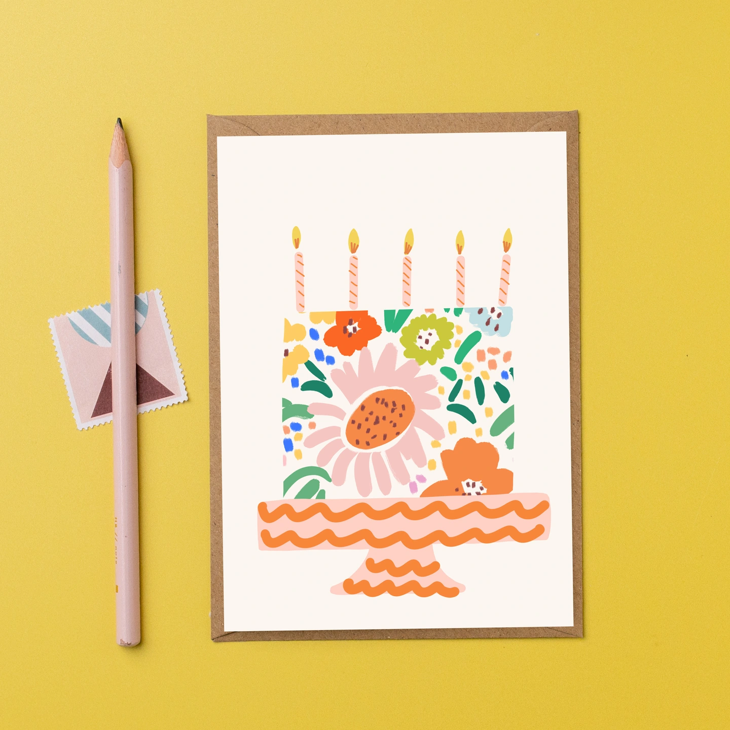 A lovely birthday card featuring a sweet illustration of a floral birthday cake with striped candles and a fun cake stand.