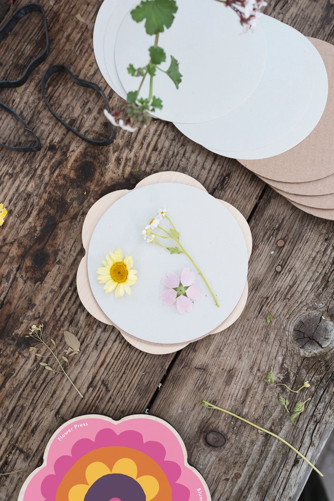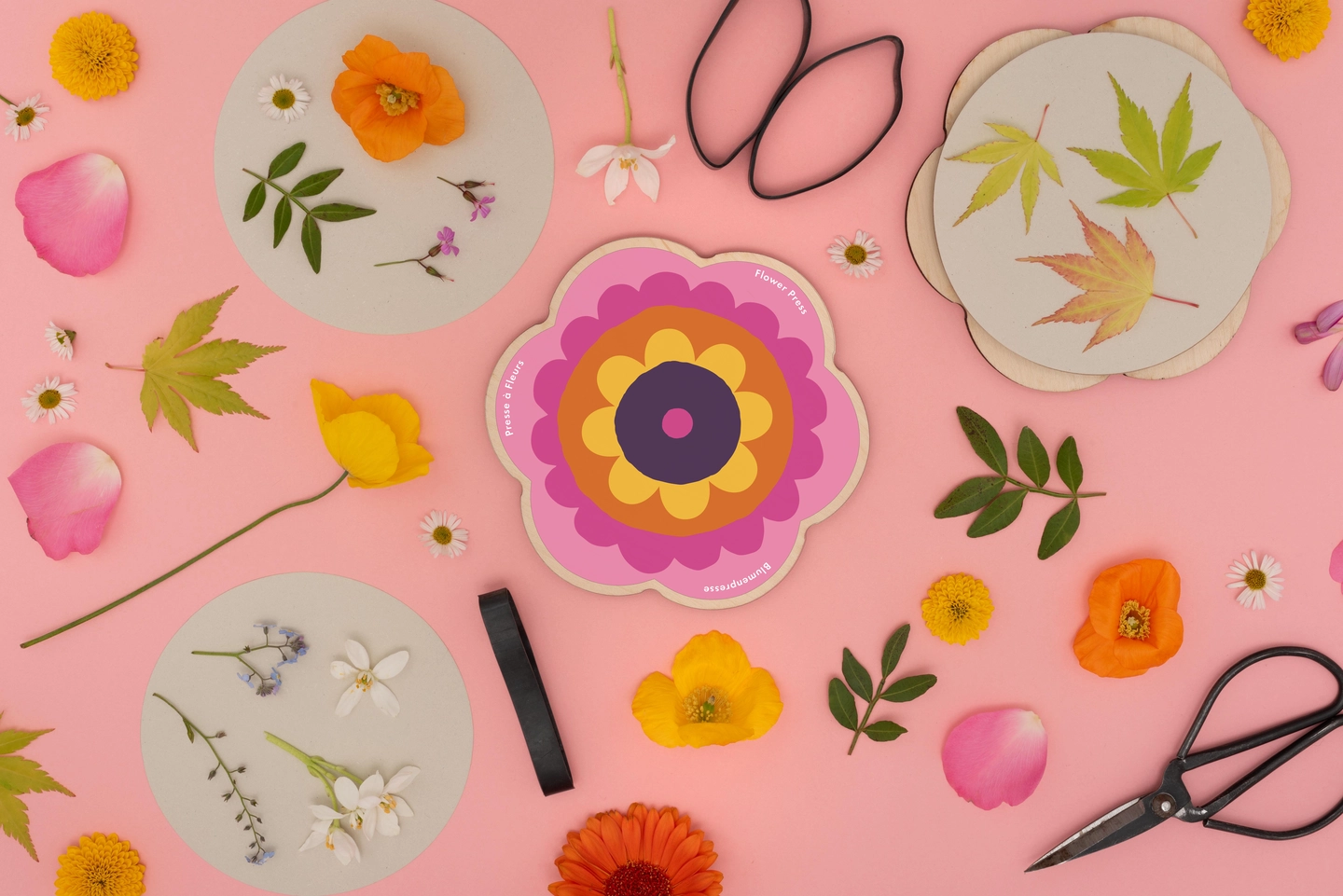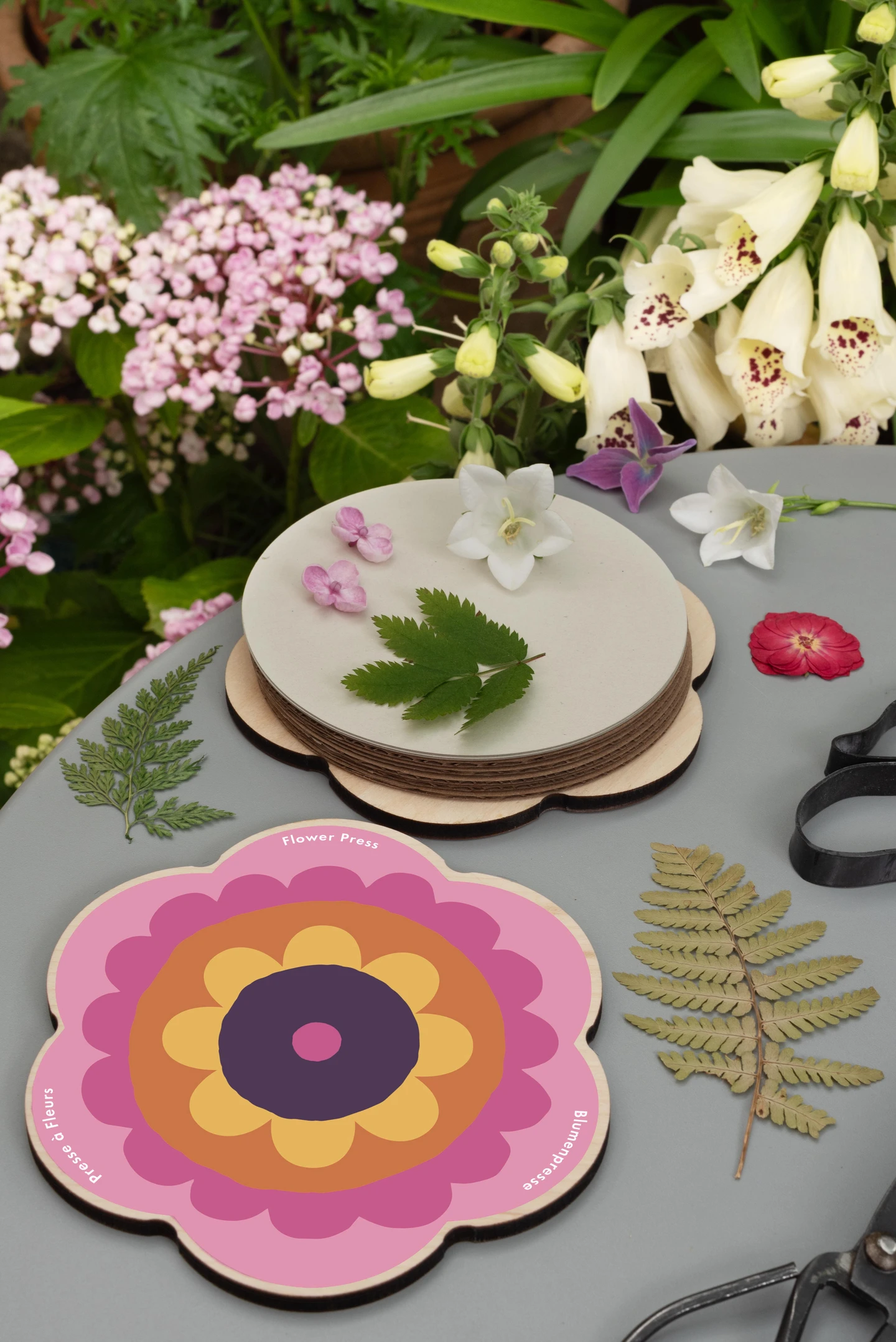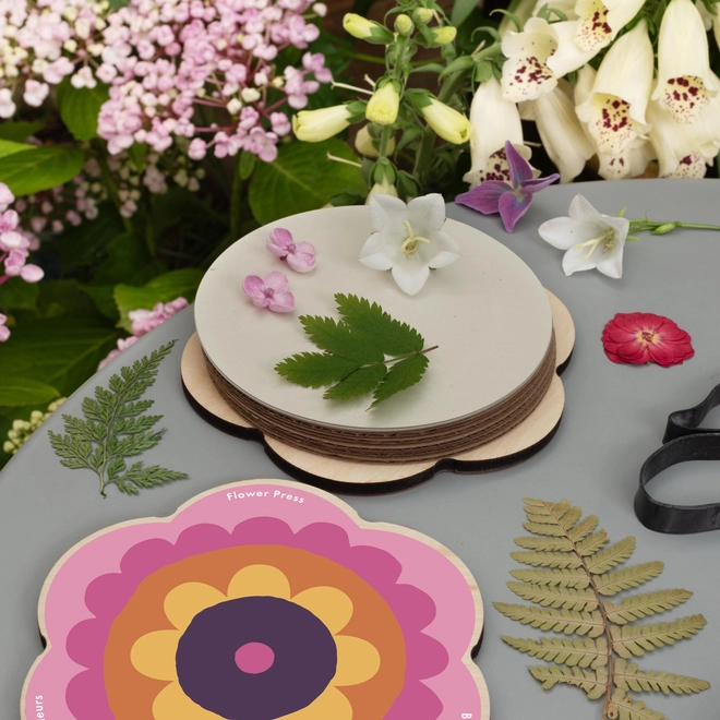 - Fasten together using the 3 elastic bands . The press comes complete with 6 sheets of corrugated card and 10 of sugar paper to give ample space to press flowers.