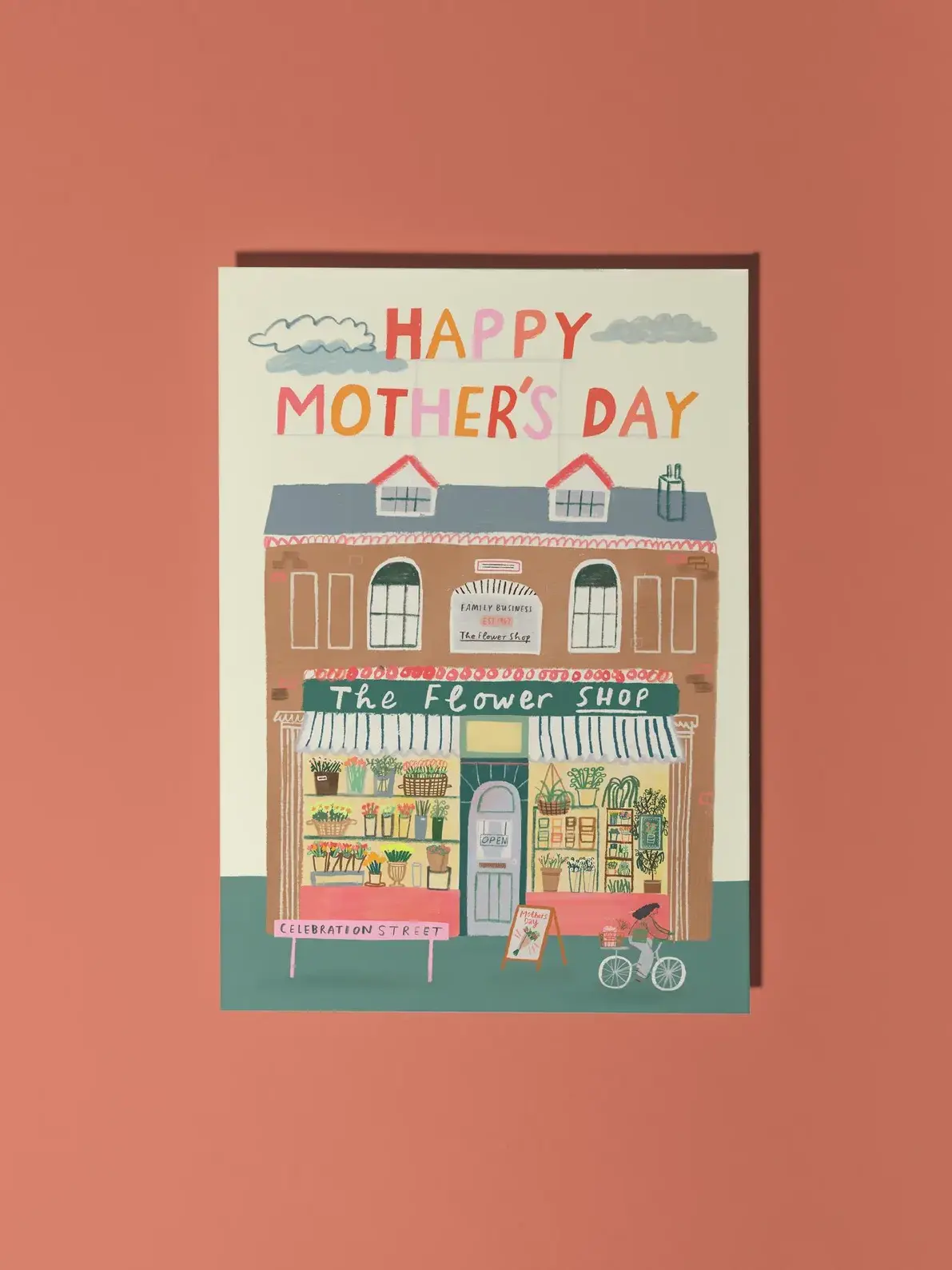 Illustrated greeting card featuring a gorgeous flower shop. Perfect for celebrating your plant or flower-loving mum.