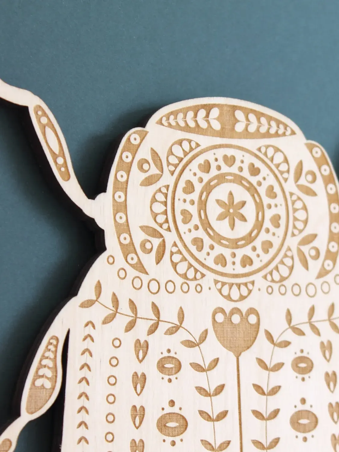 What a fancy beetle! Inspired by the Rosemary beetle (one of the cutest in my opinion!) this large wall beetle has been etched with an intricate folk art inspired pattern.