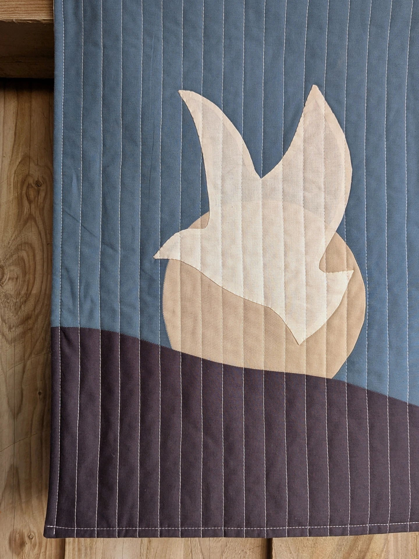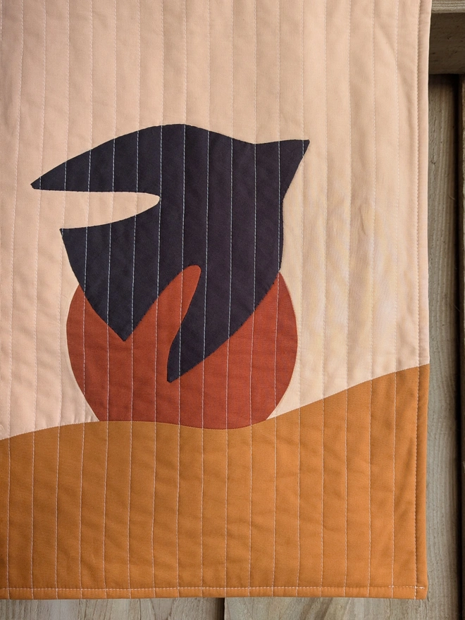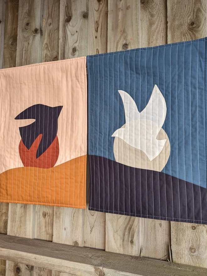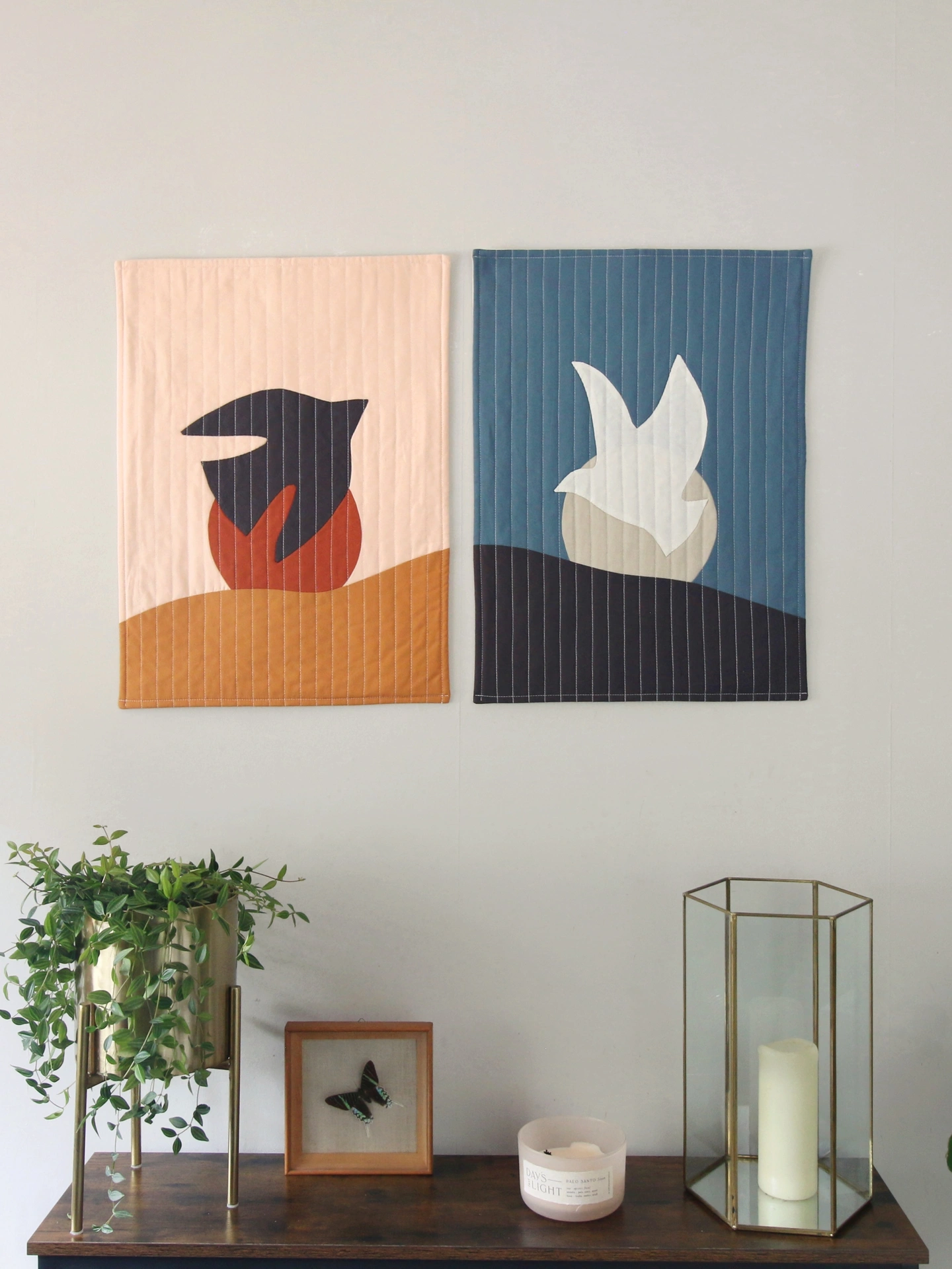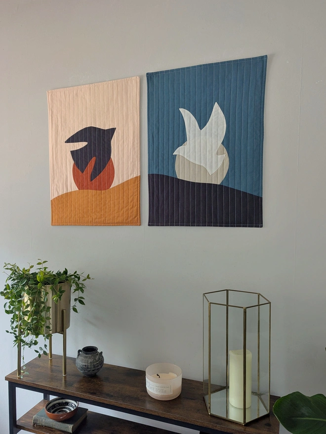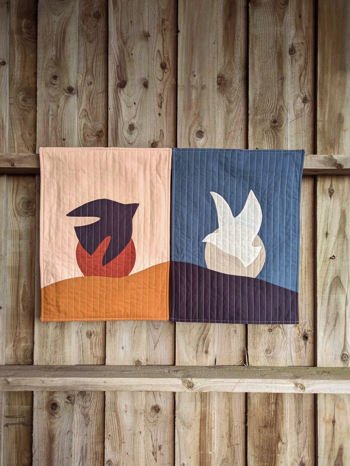 Pair of handcrafted quilted wall hangings featuring applique birds against sun and moon landscapes in contrasting colour palettes, the perfect focal point for any room. Handcrafted to order they include hanging sleeves on the reverse and a wooden dowels for simple display.