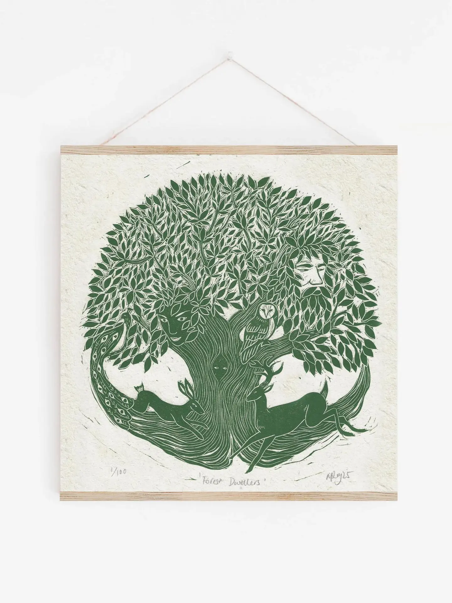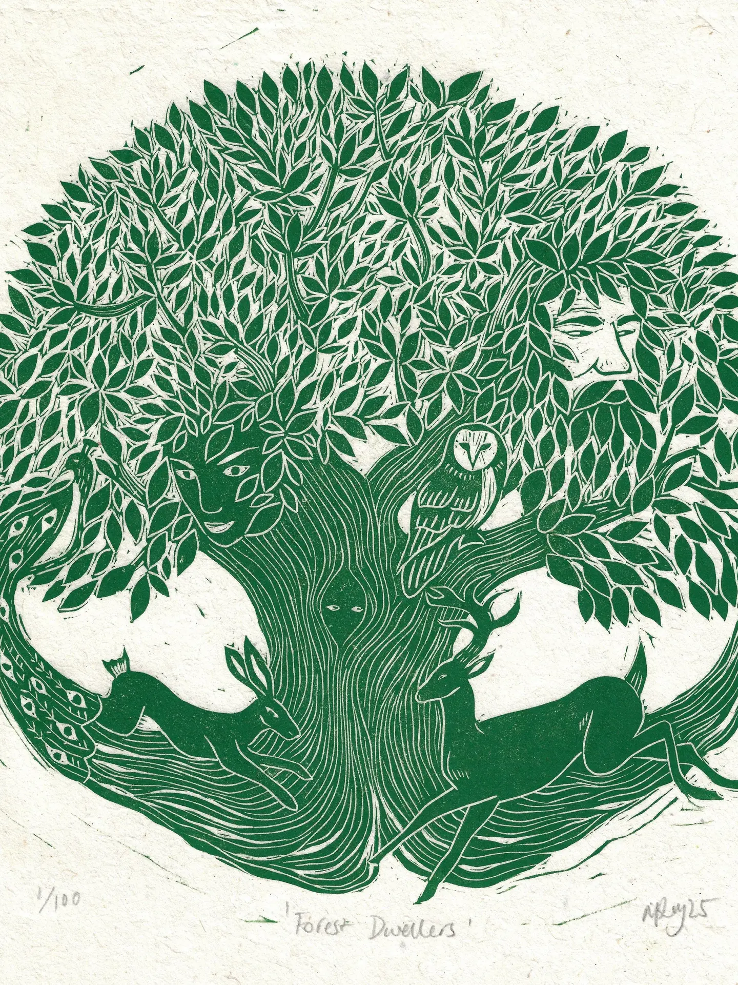 Handmade linocut print. Original linoleum print based on the traditional Celtic imagery of the Green Man and Tree of Life. Hand carved and printed using a traditional printing press.