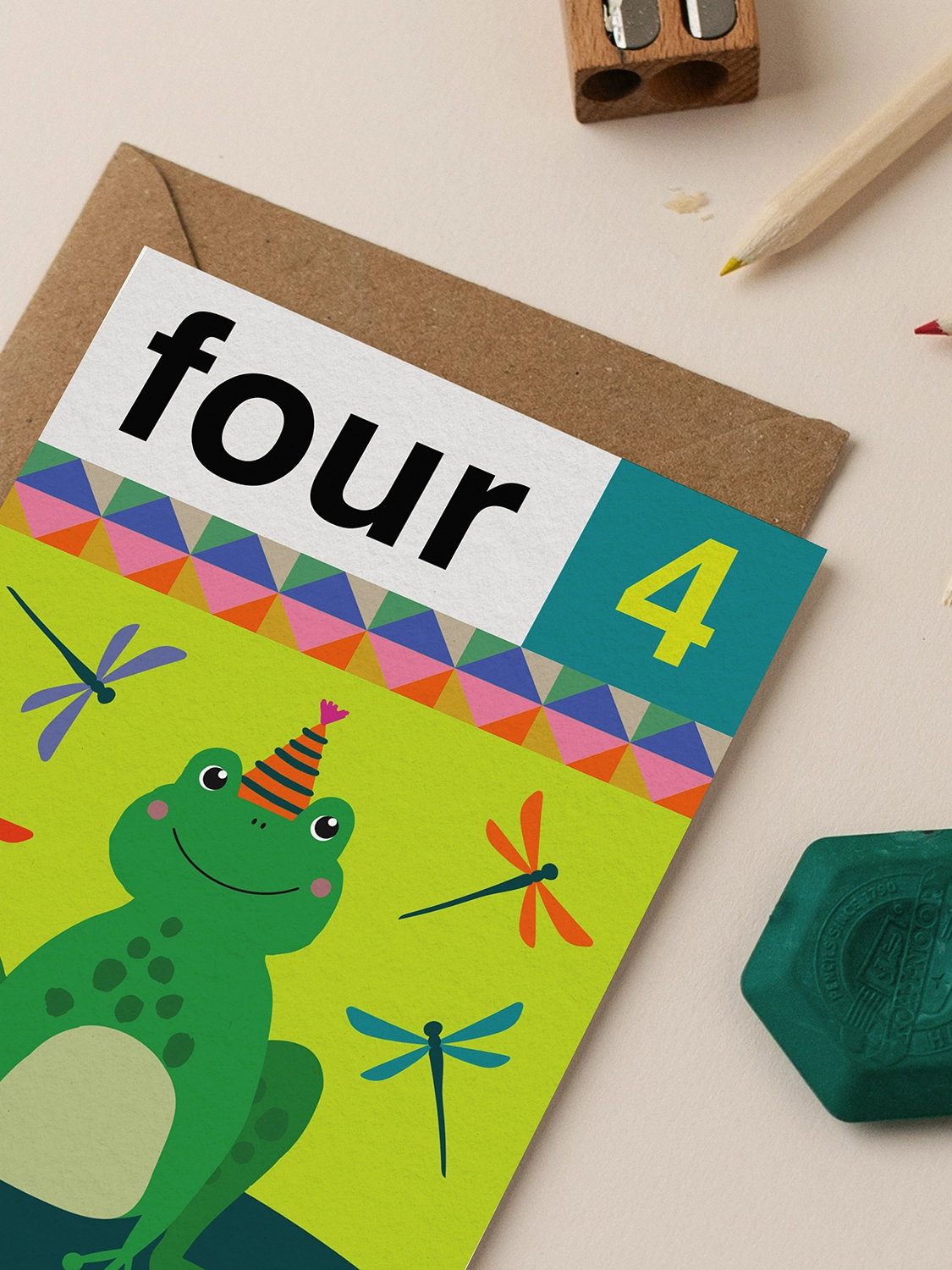 A fun-loving frog is perched on the front of this fourth birthday card, surrounded by fluttering dragonflies and a large number “four 4” caption. The brightly coloured 4th birthday card uses a gender-neutral colour palette, making it perfect for any anima...