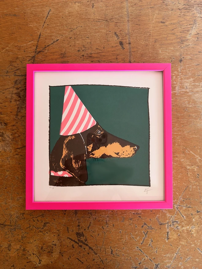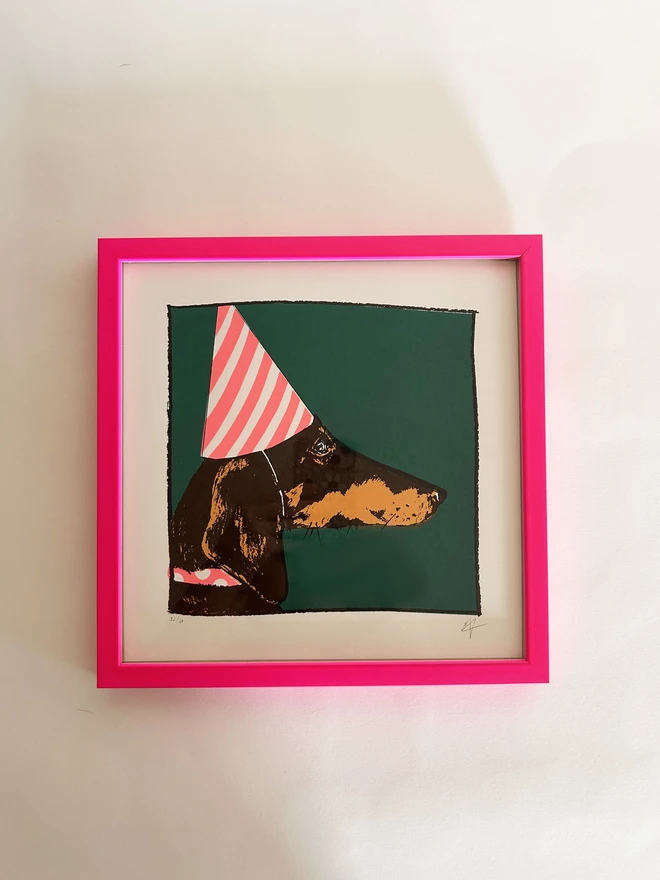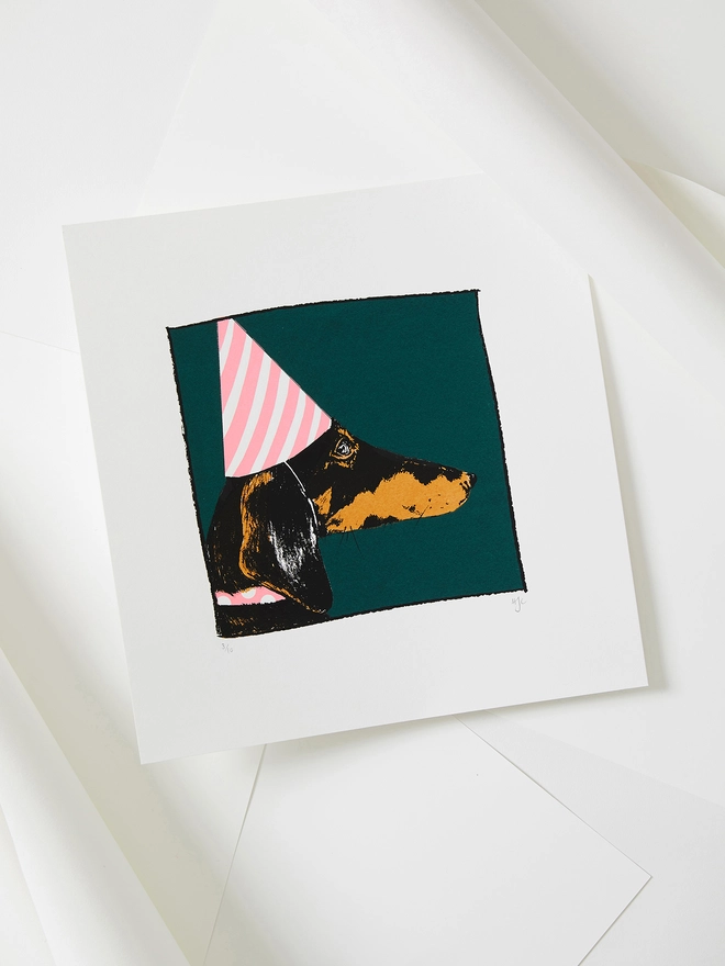 Limited edition Party Dachshund screen print, inspired by the instagram square, Hannah sketched a series of portraits of some of her favourite animal accounts and this little Sausage Dog in a Party hat caught her eye. Starting as a pencil sketch, these limited edition screen prints are built up with layers of ink to make a this fun Dachshund party print.