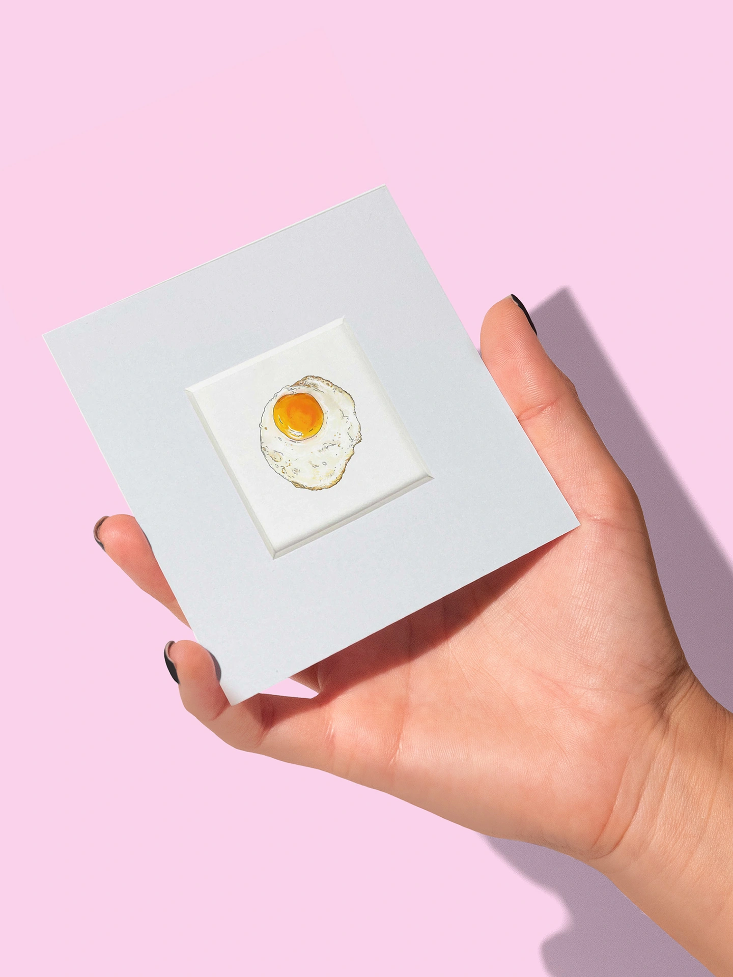 This mini Giclée print celebrates the beauty of the fried egg - a small artwork with big personality. Measuring just 10 x 10 cm (4” x 4”), each print is hand-signed and numbered in pencil by the artist. The print comes mounted on white board, ready to frame in a standard 4x4" square frame, or can be ordered framed in a matching white acrylic frame with genuine glass.
