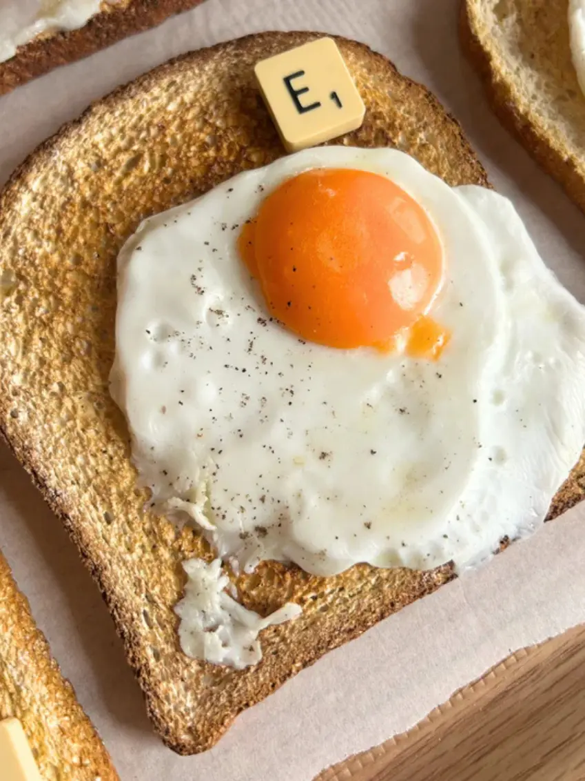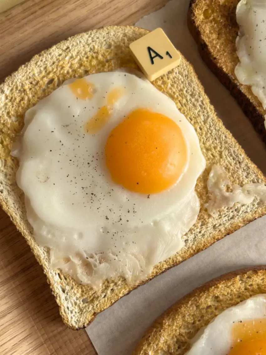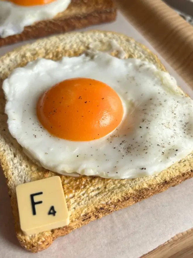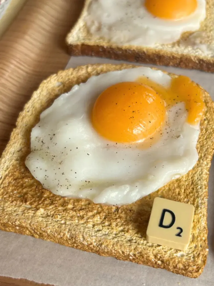 Handmade fake toast with a perfectly sculpted fried egg resting on top — yolk aglow, whites softly set. Each piece is shaped and finished by hand, capturing that moment just before the fork breaks the yolk. A simple, everyday scene made still and lasting. Ideal for window displays, table styling, or heritage-inspired sets.